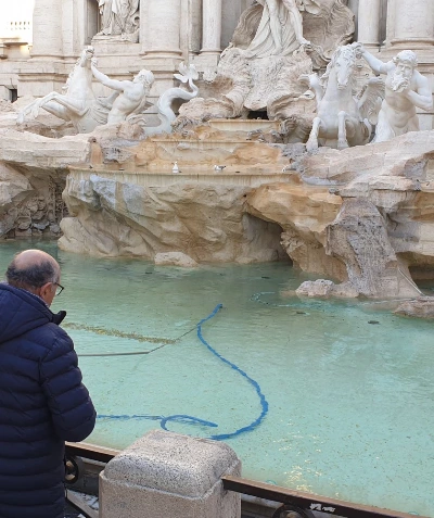 장인의 놀랍도록 맛없는 음식 품평을 하면서 몇 걸음을 옮겨 바로 트레비 분수에 도착한 우리는 또 놀랐다. 전날 우리를 매료시켰던 폭포처럼 쏟아져 내리던 분수의 물줄기는 멈춰서 있고, 분수 옆에는 경찰차와 커다란 작업트럭 그리고 현금 운반 차량 등이 어수선했다. 무슨 일인가 다가가 보니, 작업자들이 펌프와 호스가 연결된 기계로 분수 안에 쌓인 동전을 긁어내는 중이었고 분수에 가까이 갈 수 없도록 접근 금지 줄이 쳐 있었다.