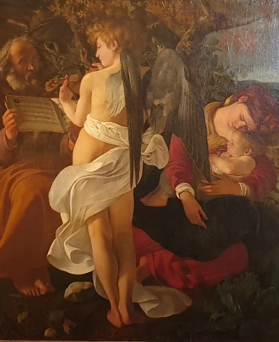 학살을 피해 이집트로 도피 중인 성가족에게 천사가 나타나 음악을 들려주고 있다. 천사의 밝은 얼굴과 몸 쪽에서는 아버지 요셉이 똑바로 앉아 천사를 향해 악보를 들고 있다. 반면 어둡게 채색된 천사의 날개가 향한 쪽에서는 아기인 예수와 성모 마리아가 곤히 잠들어 있다. 언제 끝날지 알 수 없는 고난의 여정을 무사히 마치려면, 이런 밝음과 어두움의 조화가 필요할 것이다. 둘 다 잠들면 외부에서 위험이 닥쳐올 것이고, 그렇다고 모두가 긴장 속에서 깨어있으려면 빨갛게 충혈된 눈은 제대로 보이지 않을 것이고 서로에게 신경질적이 되어 외부의 위기가 닥치기도 전에 내적인 파국에 이를지 모른다.