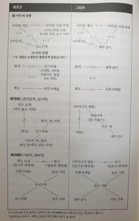페로의 버전처럼 요정이 마술 지팡이를 한번 휘둘러 순식간에 모든 걸 변신시키는 행위는 신화적으로 볼 때는 별로 고상한 방법이 아니다. 신화는 모든 중개항 사이에 연속성을 갖추기 위해 노력하는데, 페로판 독자인 근대인들은 개암나무, 재, 콩, 작은 새들 같은 생태학적 서열과 이행 관계를 이해할 수 없게 되어버렸다.