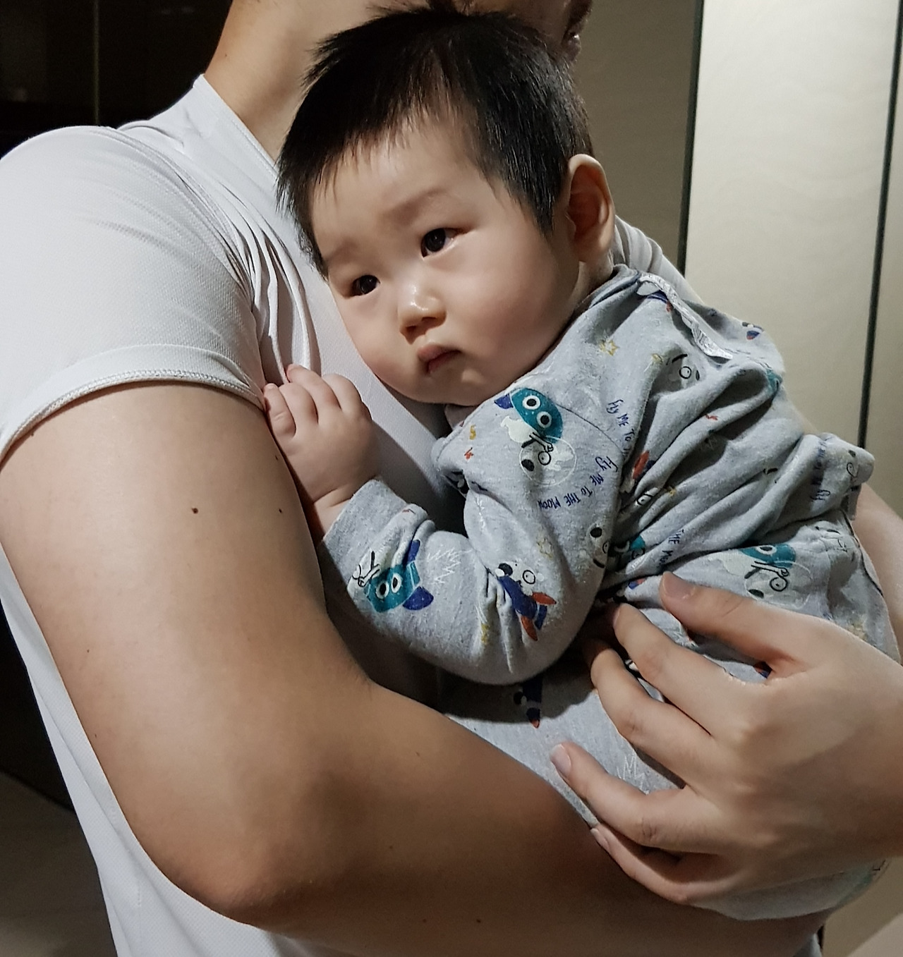 엄마 품에 안겨 있다.