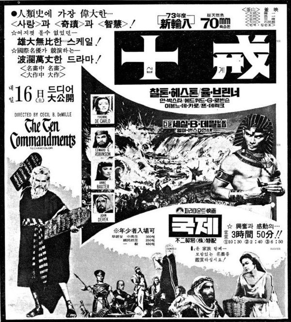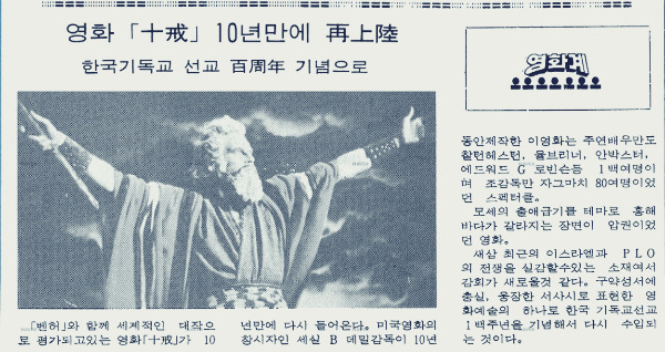 초등학교 때 처음 본 이후 <십계>를 다시 본 것은 제법 세월이 지난 후였다. 그 세월이 얼마인지 궁금해서 찾아보니, “영화 <십계> 10년 만에 재상륙”이란 제목의 기사가 있었다. "홍해 바다가 갈라지는 장면이 압권이었던 영화"라는 간단 해설로 개봉 당시에 관심 끌었던 장면까지 언급해 주는 기사였다.