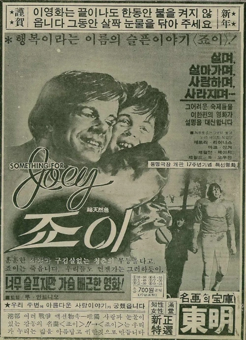 영화를 좋아하는 이라면 어릴 때 아주 재미있게 혹은 감동적으로 보았는데 그 이후에는 본 적이 없는 영화 한 편쯤은 꼭 있을 것 같다. 요즘은 오래된 영화라도 복원되어 DVD로 발매되는 경우가 많아서 다시 접하게 되는 영화도 있지만 여전히 보이질 않아서 아쉬움으로 남는 영화도 있다. 1977년의 겨울에 봤던 영화 <죠이>가 바로 그런 영화다.