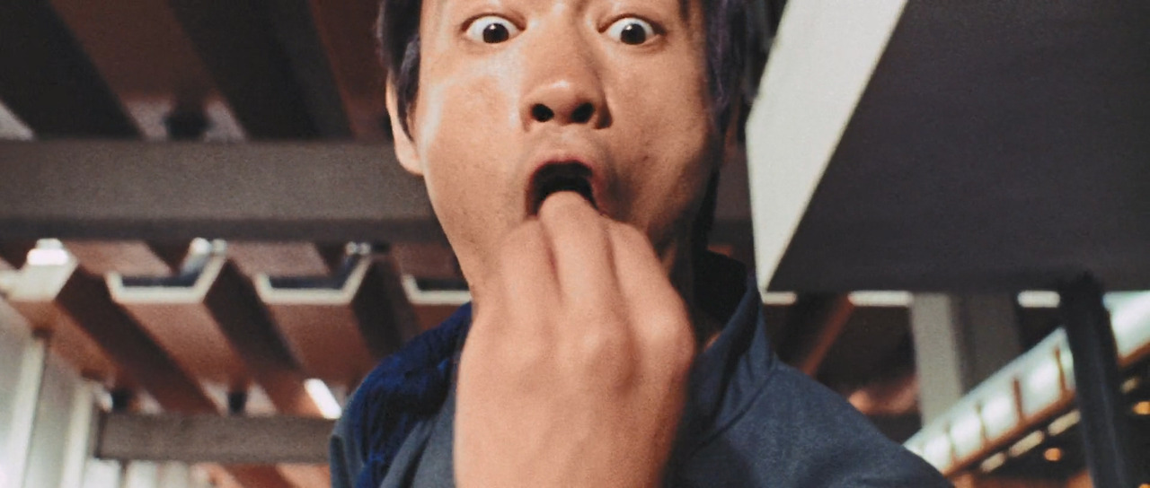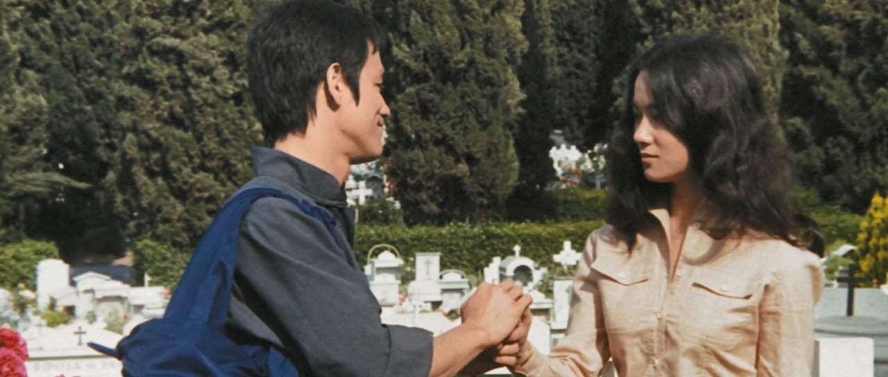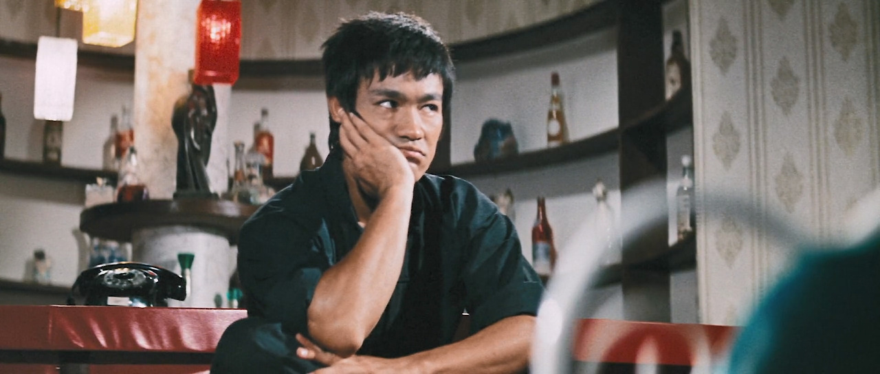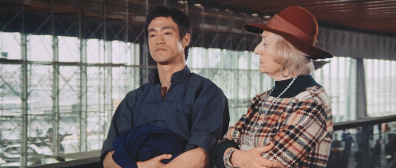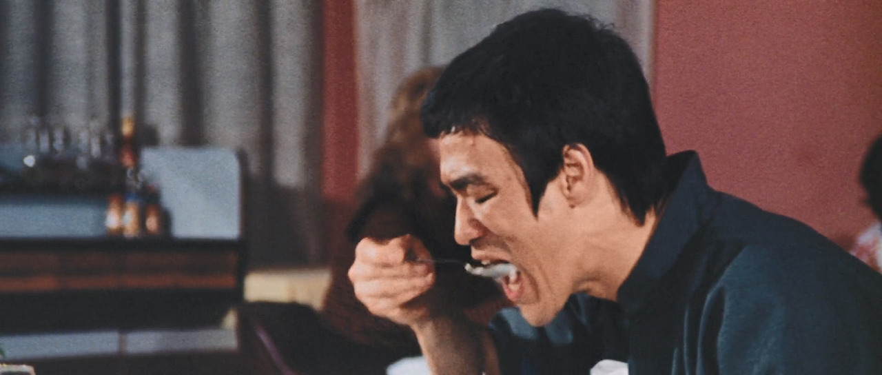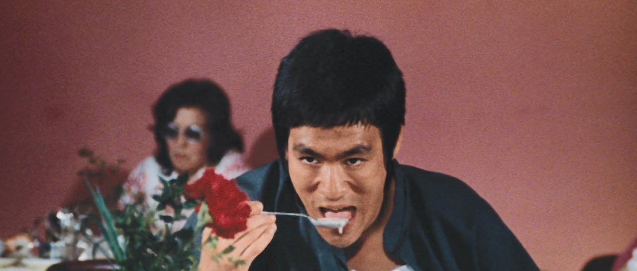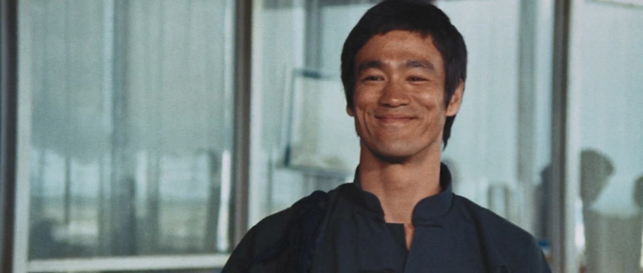 <맹룡과강>에서는 그의 다른 영화에 비해 웃기는 장면이 많이 나온다. 그것은 탕룽(이소룡)이 아무것도 모르는 촌놈이란 설정 때문이었다. 머리를 짧게 자른 탕룽의 모습이 클로즈업으로 잡힌 첫 장면부터 느낌이 왔다. 공항 로비에서부터 시작하여 공항 식당, 첸칭화(묘가수)의 집, 은행, 분수, 거리 여인의 방으로 이어지는 공간마다 이소룡은 액션 장면 하나 없이 코믹한 연기를 이어갔다. 그런데 그 일련의 장면들에서 관객을 계속 웃고 또 웃게 만든 배우가 이소룡이라는 사실이 더 웃겼다. 그걸 본 것만으로도 본전 뽑았다는 느낌이 들 정도였다면 좀 과한가? 코미디 배우라도 그렇게 계속 웃기기는 쉽지 않으니까 하는 얘기다. 주특기인 액션 장면 하나 없이 관객의 시선을 잡아 둘 수 있다는 건 아무리 생각해도 대단하다.