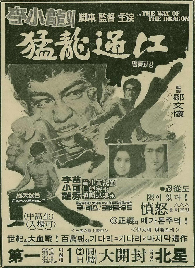 <용쟁호투>로 이소룡을 처음 보고 반하다 보니 그전에 개봉했던 <정무문>과 <당산대형>을 악착같이 쫓아가서 보고야 말았다. 세 편의 이소룡 영화는 줄줄이 같은 해에 개봉해서 볼 수 있었지만, 하나 남은 <맹룡과강>은 언제 개봉하는지를 몰라서 얼마나 기다렸는지 모른다. 심심하면 시내 개봉관에 가서 커다란 유리문 너머에 걸린 ‘근일프로 맹룡과강’이란 간판을 보고 또 보았다. 저놈의 ‘근일’이 ‘다음’으로 바뀌기를 기다리며. 개봉 날짜를 보면 세 번째인 <용쟁호투>는 1973년 12월 18일이었고, 네 번째인 <맹룡과강>은 1974년 10월 11일이었으니 10개월 정도의 시간이 걸렸다. 그 10개월은 정말 기나긴 시간이었다.