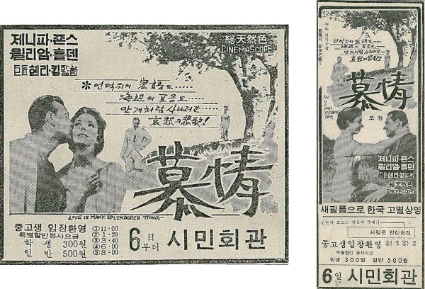 고등학교 입학 후 처음으로 본 영화가 무엇일지 궁금해서 신문 광고를 찾아보니 생각보다 쉽게 답이 나왔다. 예전부터 고전 영화 <모정(Love Is a Many-Splendored Thing, 1955)>을 부산 시민회관에서 봤다는 사실은 분명히 기억하고 있었지만 그게 언제인지 아리송했었는데 그 답을 찾은 것이다. 그해 3월 6일부터 시민회관에서 새 필름으로 <모정>의 한국 고별 상영이 시작된다는 신문광고를 발견한 것이다. 3월 초 즈음에 개봉관에서 상영이 시작된 영화를 살펴보니 머릿속에 남은 영화는 하나도 보이질 않았다. 그렇다면 이 기회에 고교 입학 후 처음으로 극장 가서 본 영화는 <모정>이었던 것으로 공식적인 기억에 새겨두어도 되겠다.