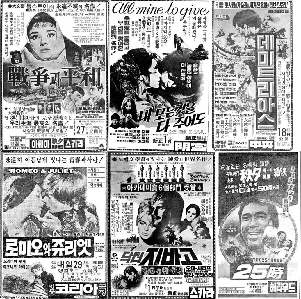 예전보다 편수가 줄었다는 느낌이 들긴 하지만 때가 되면 재상영되는 추억의 고전 영화들은 여전히 있었다. 그때 처음 본 영화들도 여러 편이었는데 그중 고교생들에게 가장 화제작은 <로미오와 줄리엣>이었다. 당연히 올리비아 허시의 미모 덕분이었다. <25시>를 보면서는 안소니 퀸이라는 배우가 왜 연기를 잘한다고 난리들인지 알 것 같았다. <내 모든 것을 다 주어도>는 영화를 보기 전까지는 오래된 영화인지조차 몰랐다. 1957년에 만들어진 영화지만 늦게 개봉된 경우라서 우리나라에서 첫 상영이었다. 그런 점에서 보자면 새 영화인 셈이다. 전형적인 우리나라 관객의 정서 맞춤용 영화로 많이들 보고 울었다. <전쟁과 평화>는 배우 ‘오드리 헵번’ 그리고 마르고 닳도록 들었던 주제곡 ‘나타샤의 왈츠’만 생각하더라도 기필코 봐야 할 영화였다. 개인적으로는 <닥터 지바고>가 당시에 본 고전 영화 중에서 가장 기억에 남는다. 거기서 들리는 음악과 거기서 보이는 영상만으로도 인상적이었다.