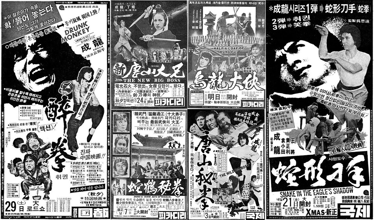 클린트 이스트우드와는 다른 경우지만 그때 많이 볼 수 있었던 또 한 사람의 배우로는 성룡을 꼽을 수 있다. 무술영화의 붐에 따라 무수한 배우들이 등장했지만 이때의 성룡은 이소룡의 클론도 소림사도 아닌 다른 방향의 바람을 만들고 있었다. 날렵한 몸으로 아크로배틱을 연상시키는 무술 동작으로 서서히 성룡의 존재가 부상하기 시작했던 시기가 이때였다. 한국과 홍콩이 합작했다는 광고와 함께 성룡을 주연배우로 내세웠던 영화들이 <신 당산대형>, <사학비권>, <당산비권>등이었는데 꽤 볼만한 무술 장면이라는 생각을 갖게 한 영화들이었다. 재미있는 것은 이때 성룡은 전혀 유명하지 않았기 때문에 주연이어도 광고에서 그의 이름을 내세우지 않았다는 사실이다. <사학비권> 같은 영화 광고에서는 주연 배우 사진 세 장이 떠있는데 거기에 성룡은 끼어있지도 않았다. 곡예 같은 무술 동작에 코믹함을 섞은 코믹 쿵푸 영화 <취권>으로 대박을 날리며 결국은 슈퍼스타 타이틀을 거머쥐게 되지만, 성룡이 그렇게 될 조짐을 보이고 있었던 때가 그때였다. 엄청난 히트를 기록한 <취권>은 1979년에 개봉되었고, 그 이후에는 그전에 찍었던 그렇고 그런 영화도 수입하여 개봉하면서 성룡이라는 이름을 크게 걸기 시작했다.