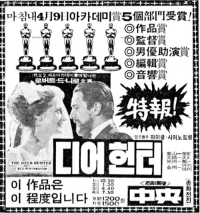 고교생이 되면서 영화를 볼 수 있는 자격도 좀 더 얻었고, 그러다 보니 영화를 볼 수 있는 폭도 넓어진 것 같아서 뿌듯했다. 그때를 생각할 때 잊을 수 없는 기억 하나는 <디어 헌터>의 상영과 맞물린 일이다. 아카데미 작품상을 받은 영화도 화제를 몰고 다닌 영화도 우리나라에서는 보기가 쉽지 않았다. 비싸서 그랬는지 수입이 늦게 되는 경우가 대부분이었고, 우리나라 수준을 스스로 낮게 보았는지 아예 수입을 못하게 해서 상영되지 않는 영화들도 많았다. 외국 서적 골목에서 ‘스크린’이나 ‘로드쇼’ 같은 일본 영화 잡지를 뒤적거릴 때면 우리나라에서 볼 수 없는 영화들의 일본 포스터를 보며 많이 부러워했었다. 우리나라에서는 수입도 하지 않았는데 일본 텔레비전에서 방영 프로그램에 끼어있는 영화를 보면 더더욱. 그런 시절이었는데 우리나라에서 상영 중이던 <디어 헌터>가 아카데미 작품상을 받았으니 화제가 될 수밖에 없었다. 재미있었던 일은 아카데미상을 받기 전에는 그다지 관객이 몰리지 않았는데 아카데미 작품상 발표가 되자 관객 수가 늘기 시작하여 결국 흥행에 성공했다는 사실이다. 우리 관객은 상에 약하다는 비판적인 기사가 실리기도 했지만 우리나라 상영이 그만큼 빨라졌다는 사실에 기뻐했던 기억이 난다. 이제 우리도 제때 영화를 볼 수 있게 되었구나 싶어서.
