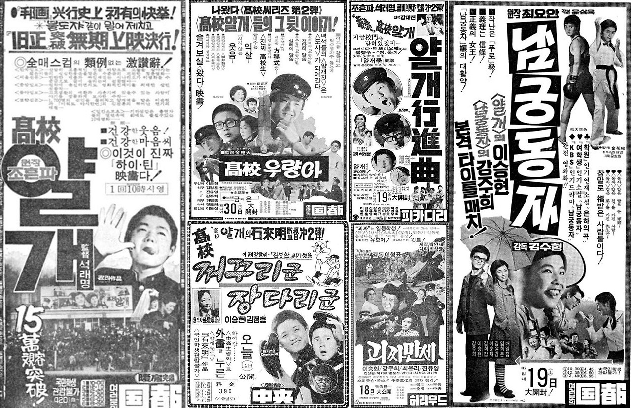 고교 시절이 시작되자 얼마 지나지 않아 그것을 축하라도 해주듯 제목까지 딱 어울리는 영화가 나타났다. 조흔파 원작의 <고교 얄개>라는 영화다. 이 영화가 등장하여 인기를 얻게 되자 임예진의 하이틴 영화가 붐이 일었듯 '고교'나 '얄개'가 붙은 비슷한 영화들이 새로운 장르처럼 퍼져 나갔다. 임예진 시리즈에 이어 얄개 시리즈 즉 이승현 시리즈가 등장한 셈이다. 임예진 시리즈가 동력을 잃어갈 즈음 다시 힘을 보탤 국산 영화 돈벌이 장르가 개발(?)된 것이다. 유치한 데서 벗어나겠다고 눈에 힘을 줘봐도 동년배 배우들이 주연하는 얄개 영화의 유혹에서 벗어나긴 힘들었다. 그 속에는 예쁜 동년배 여학생 배우들이 속속 등장하여 더욱더 보고 싶게 만들기도 했다. 그 중심에 있는 인물은 야무지게 생긴 강주희였다. 하지만 강주희 영화를 따로 볼 필요는 없었다. 대부분의 이승현 영화가 곧 강주희 영화였으니까. 이승현이 인터뷰에서 자신이 주연한 얄개 어쩌고 고교 어쩌고 하는 영화만 하더라도 24편이나 만들어졌다고 했으니 그 시절이 고교 시절이었던 우리는 미우나 고우나 그런 영화 간판을 항상 보고 다녔던 셈이다.