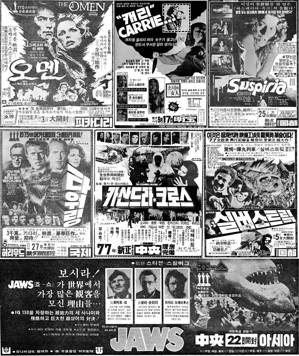 재난영화와 공포영화를 제법 많이 볼 수 있었던 것도 그 시절의 큰 특징이었다. <죠스> 같은 영화는 너무 유명해서 들어오기까지 시간이 걸렸는데 그러다 보니 소위 짜가 영화까지 출현했을 정도였다. 리메이크작이지만 <킹콩>도 성공한 영화였고, <오멘>이나 <캐리>도 대단한 성공작이었다. <써스페리아> 같은 경우는 저렇게 무서운 영화는 처음이라는 생각을 서슴없이 할 수 있을 정도였고, 그 주제곡 테마도 전파를 많이 탔을 정도로 유명했다. <타워링>은 주연 배우들만 봐도 보고 싶은 마음이 들 정도의 호화 캐스팅에 단단한 스토리로 짠한 감동까지 전해준 영화였고, <카산드라 크로스>와 <실버스트릭>도 당시에 꽤 화제를 모았던 영화들이다. 기본적으로 장르적인 재미도 있었지만 사회적으로 시사하는 바도 있었기에 이모저모로 인기를 끌었던 영화들이었다.