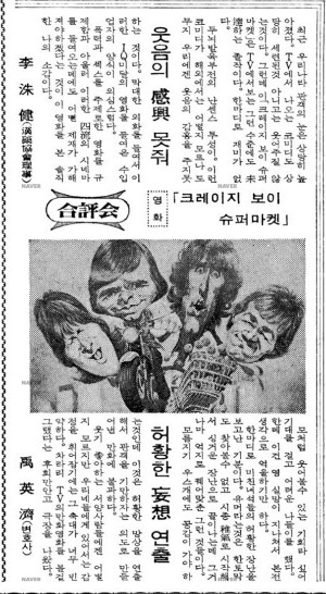 그런데 안타까운 것은 첫 번째 소개된 <크레이지 보이>의 인기를 발판으로 계속해서 수입되었던 '크레이지 보이' 영화들에서 관객들의 기대가 깨져버린 것이다. 더 웃기지는 못할지언정 비슷하게는 웃겨주리라는 기대마저 깨지는 바람에 우리나라에서의 ‘크레이지 보이’ 바람은 잦아들고 말았다. 두 번째로 개봉한 <크레이지 보이 슈퍼마켓> 그리고 세 번째로 개봉한 <크레이지 보이 스페인 소동> 두 편 모두 우리나라에서 웃기는 데에는 실패한 것이다. 두 해에 걸쳐 세 편의 ‘크레이지 보이’ 영화를 줄줄이 개봉하더니 그것으로 끝이었던 셈이다. 당시 신문에서는 <크레이지 보이 슈퍼마켓>에 대하여 비판하는 칼럼을 싣기도 했는데, 신랄하게 비판하는 내용임에도 불구하고 지금 보면 웃음 터지게 만드는 면이 있다.