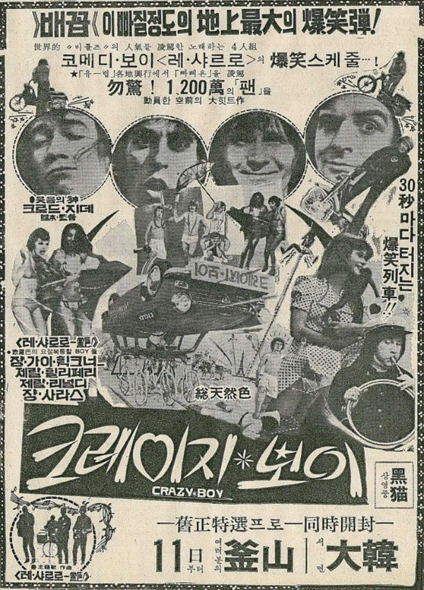 <크레이지 보이>를 선전하는 신문광고에서의 카피다. 얼토당토않게(?) 비틀즈와 비교하는 문구가 바로 궁금했던 해답의 키였다. 당시에도 “레 샤를로(Les Charlots)“라는 그룹으로 소개를 하고 있었기에 그들이 가수 역할도 한다는 정도는 들은 셈이다. 하지만 그들의 노래를 들어본 적도 없고 그들의 음반을 본 적도 없고 그런 그룹 이름을 들어본 적도 없으니, 그들이 가수로 유명하리란 생각은 전혀 하지도 못했고 솔직히 관심도 없었다. 그런 기사나 카피를 보면, 코미디언이면서 가수를 겸하나 보다 정도로만 생각했다. 그런데 알고 보니 자신들이 출연한 ‘크레이지 보이’ 시리즈의 영화음악도 그룹 ‘레 샤를로’ 즉 본인들이 작곡할 정도로 진짜 뮤지션이었다. 레 샤를로라는 그룹은 1966년부터 활동한 프랑스의 4인조 밴드로 1968년에는 롤링스톤지에서 최고의 프랑스 록 음악가로 선정할 정도로 유명한 그룹이었다. 그들의 그룹명은 프랑스의 그룹인 만큼 ”레 샤를로(Les Charlots)“였지만, 영어권 국가에서는 ”크레이지 보이즈(The Crazy Boys)“라고 불렀다는 것이다. 프랑스의 그룹 레 샤를로가 출연한 영화 제목에 ‘크레이지 보이’가 들어간 이유는 바로 그것이었다. 레 샤를로라는 이름으로 유명은 하지만 그 이름으로 모두에게 유명하지는 않았던 까닭이다.