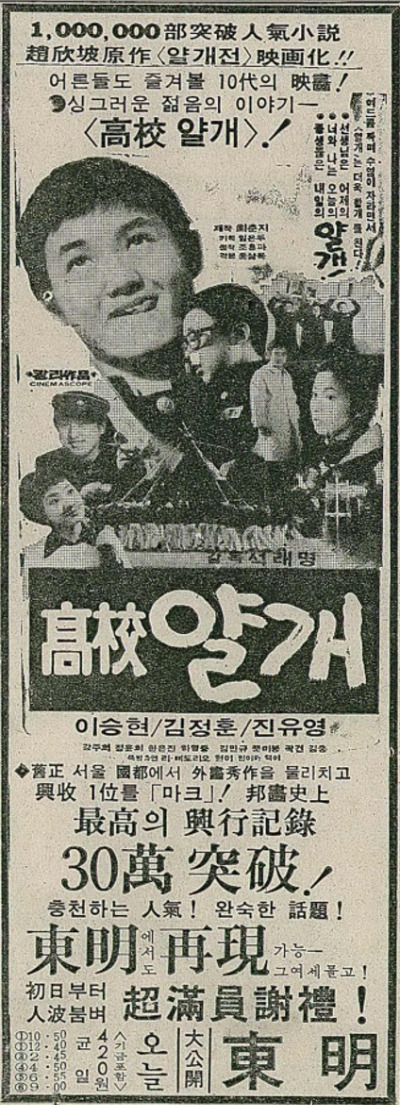 고등학교에 입학해서 같은 반 친구들 얼굴이 채 눈에 익기도 전에 ‘고교’라는 단어를 머리에 붙이고 출현한 영화가 있었다. 그리고 이미 서울에서 대성공했다는 카피까지 신문광고에 달고 나타났으니 같은 처지에 있는 고교생인 바에야 궁금하지 않을 수가 없었다. 거기다가 ‘얄개’라는 단어가 어떤 의미로 쓰이는지 알고 있었으니 더욱더 그랬다. 보러 가긴 가야겠는데 고교생 교복 입은 지 얼마 되지도 않아서 그런지 혼자서 가긴 좀 어색한 기분이 들었다. 고민 끝에 같은 반 친구를 꼬셔서 갔다. 그 영화의 제목은 <고교 얄개>였고 '고교'나 '얄개'를 제목 서두에 달고 줄줄이 나왔던 시리즈의 신호탄이었다.