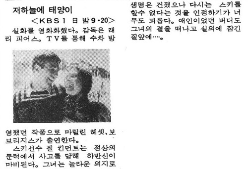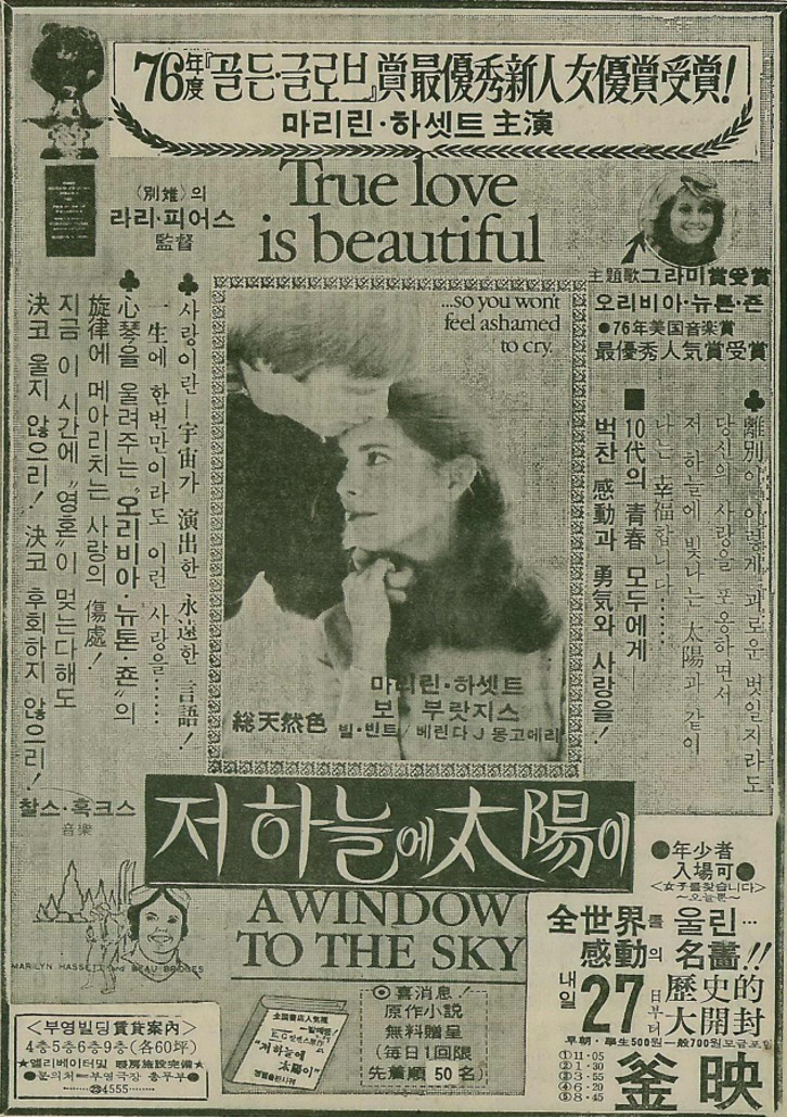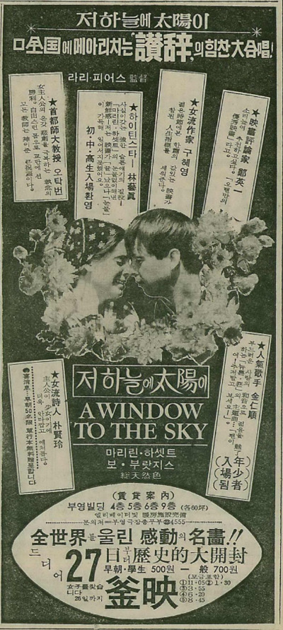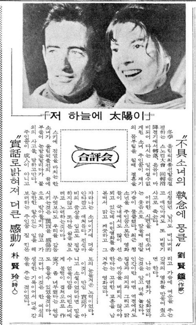<저 하늘에 태양이>는 우리나라에서 서울 개봉관에서만 20만에 가까운 관객이 들었다고 하니 제법 흥행에 성공한 작품이다. 슬픈 사랑에 약한 우리나라 정서에 맞는 작품이라서 어느 정도 예상되는 결과이지 않았을까. 그런데 주인공이 너무 시련의 연속이라서 꾸며낸 이야기라고 생각하는 사람들이 많았었다. 그래서 실화라는 사실을 알고 깜짝 놀랐다는 이야기도 많이 돌았던 영화였다. 당시 신문 칼럼이나 광고에 실린 내용을 보면 그런 분위기도 엿볼 수 있고, 영화에 대한 평가가 꽤 좋았다고 느껴진다.