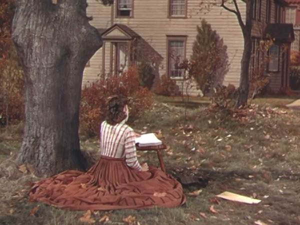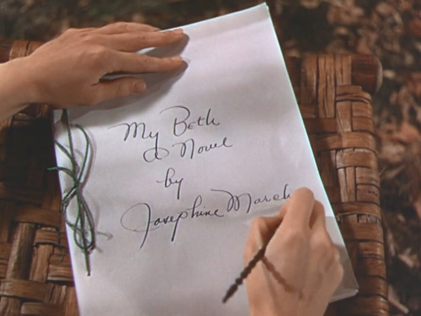<푸른 화원>의 클라이맥스라고 하면 베스의 죽음이고, 조세핀이 소설을 마무리하는 장면으로 대단원의 막이 서서히 내려가기 시작한다. “나의 베스”라는 제목과 “조세핀 마치”라는 이름을 쓰고, 다음 페이지에 “지금은 떠나고 없는 내 동생 베스에게 바친다. (Dedicated to my sister Beth who is now parted from me.)”는 문자 대사로 – 더빙이었던 그때의 대사를 정확히 기억하지는 못한다 – 베스가 세상을 떠났다는 사실을 알린다. 조가 진정으로 자신의 가슴에 사무친 이야기를 썼다는 느낌이 감동으로 다가왔던 장면이다. 거기서 받은 감동이 너무 커서였는지 그걸로 영화는 끝난 걸로 생각될 정도였다. 멍했던 기분에 그 뒤로는 무슨 장면을 보았다는 느낌이 들지 않아서였을 것이다.