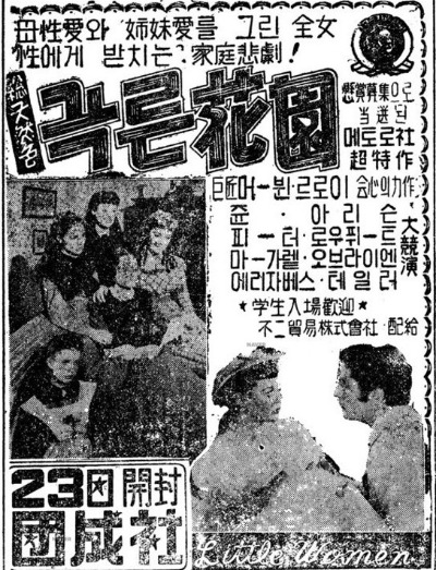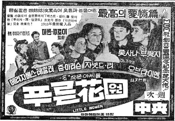 그런데 왜 제목을 ‘푸른 화원’이라고 붙였을까? 「작은 아씨들」이 원작인 걸 안 다음부터 개봉 제목을 그렇게 지은 이유가 궁금했다. 생각이 가는 대로 이것저것 자료를 찾아봐도 정확한 이유는 알 수 없었다. 1949년도 버전의 영화 개봉 이전에 원작 소설 제목을 「푸른 화원」이라고 붙였던 흔적도 찾지 못했고, 1933년도 영화의 제목을 <푸른 화원>이라고 붙이지도 않았으며, 다른 나라의 제목이 그랬던 흔적도 찾지 못했다. 추정이지만, 원제와 상관없이 감성적으로 그럴싸한 제목을 붙이려고 그랬던 게 아닐까 싶다. 이 영화의 감독 머빈 르로이 감독의 작품만 하더라도, <Waterloo Bridge>가 <애수>가 되고 <Random Harvest>가 <마음의 행로>가 되었듯이.