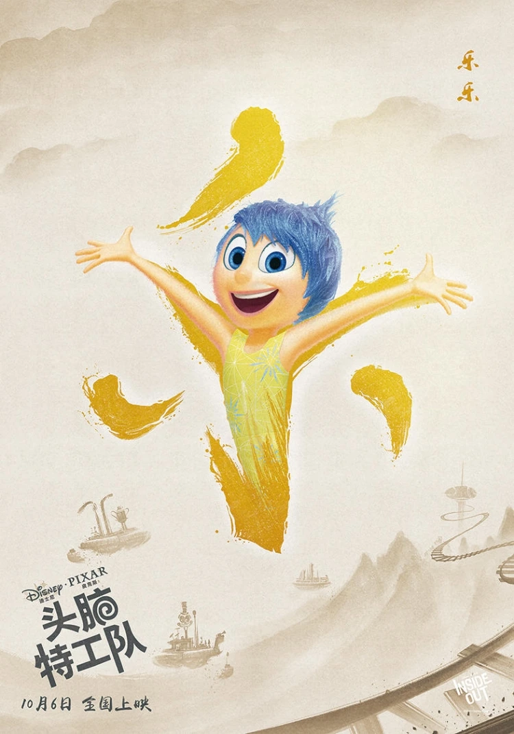 '인사이드 아웃 2'는 개봉 전부터 각국의 독특한 포스터 아트가 화제를 모았는데요. 특히 중국과 한국에서 공개된 포스터들은 각 나라의 문화적 특징을 잘 반영하고 있어 많은 이들의 관심을 끌었습니다. 중국 버전의 포스터는 영화 속 주인공들의 얼굴을 한자 문자로 표현하여 동양적 미학을 드러낸 모습. 주인공 기쁨이의 중국 이름은 ‘즐기다 락(樂)’을 따서 ‘러러’가 되었네요. 또한 캐릭터들이 전통 의상을 입고 있는 모습이나 포스터의 배경 역시 중국의 전통적인 건축물과 풍경을 활용했다는 점도 이목을 집중시킵니다.