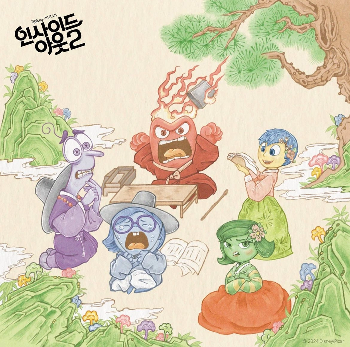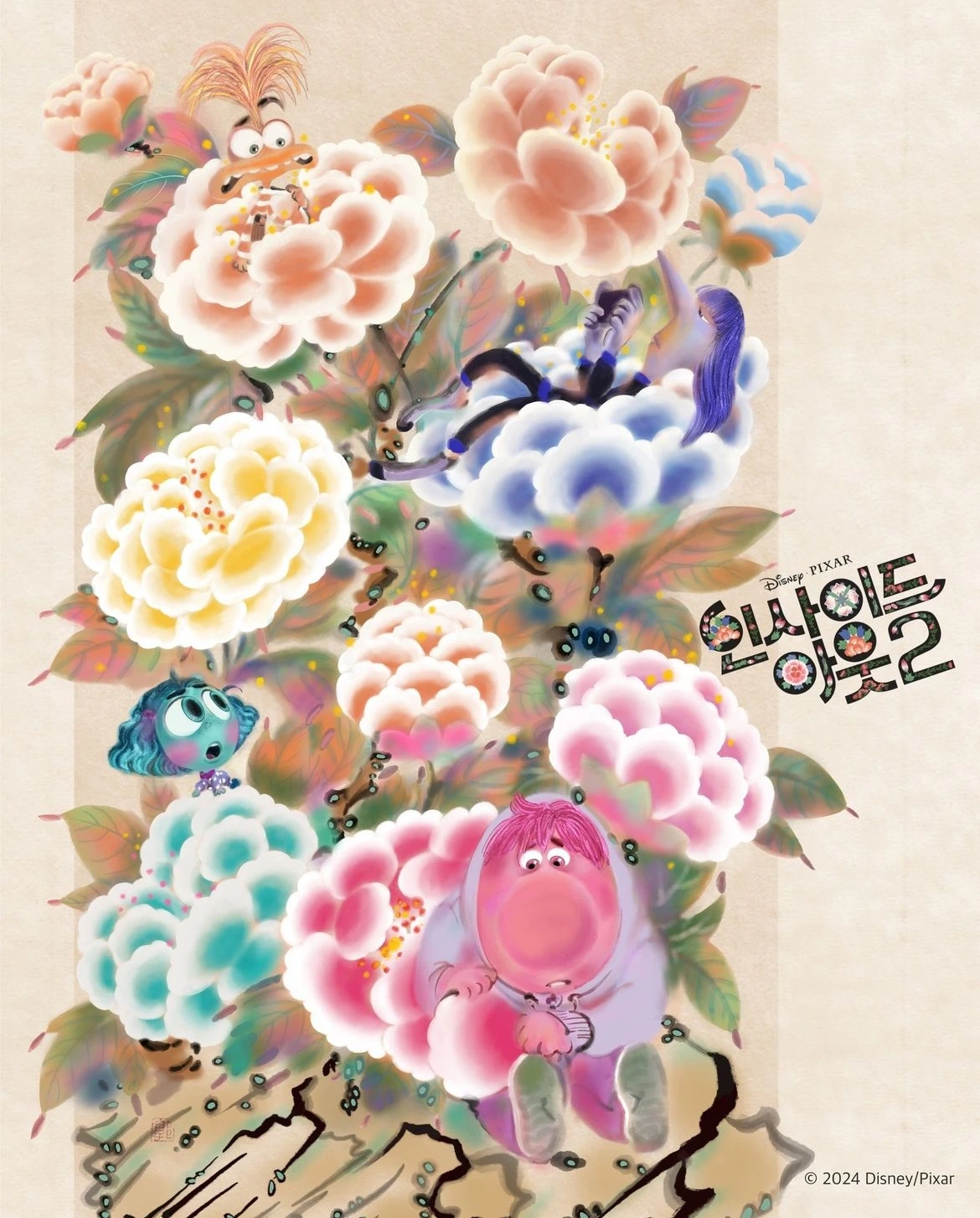 다음으로 한국 버전의 포스터는 영화 속 감정 캐릭터들을 한복을 입은 모습으로 표현했습니다. 타이틀 디자인 또한 한국적 미감이 돋보이는 서체로 표현하거나, 복을 기원하는 모란에 의미를 빗대어 소중한 성장 과정이라는 메시지를 담아냈는데요. 풍속화 ‘서당’을 모티브로 하여 ‘버럭’ 훈장님의 호통까지 볼 수 있네요. 단순히 영화의 내용을 홍보하는 것을 넘어, 시각적인 아름다움과 문화적 요소를 동시에 제공하려는 노력이 돋보이는 각국의 포스터 아트. 이를 본 관람객들은 이러한 포스터를 통해 자신들의 문화가 글로벌 무대에서 존중받고 있다는 느낌을 받아 영화를 기대하게 된다고 언급했습니다.