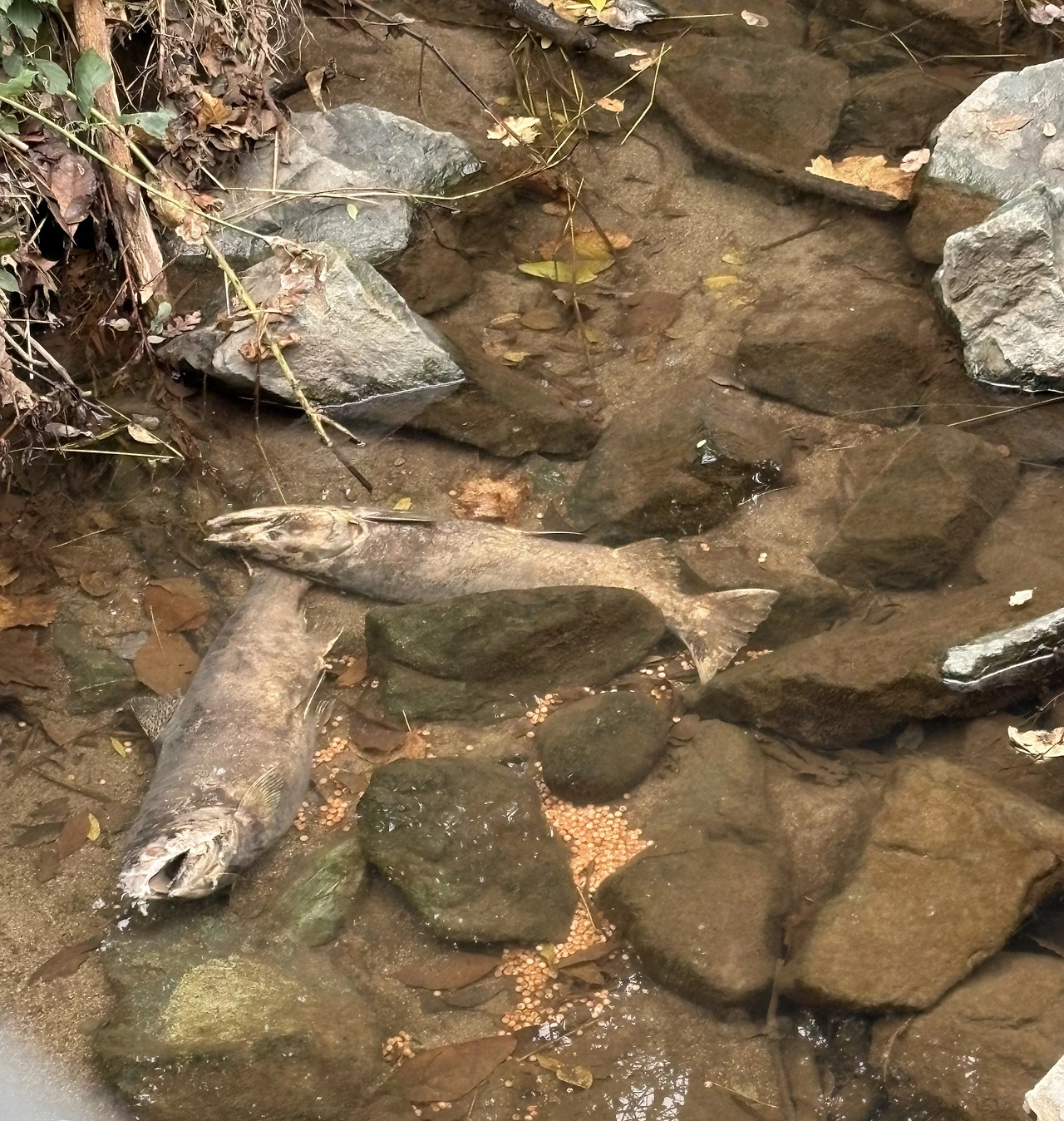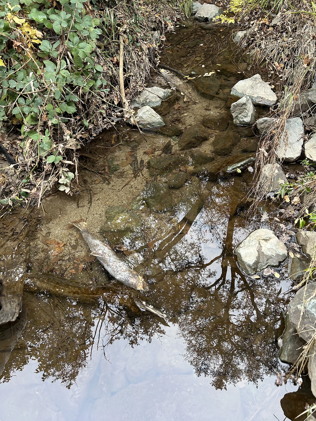 11월 27일은 추수감사절이었다. 자주 가던 배니스터 공원에 산책하러 갔다가 놀라운 광경을 발견했다. 아주 좁은 개울에 연어 두 마리가 올라와 죽어 있었고 그 옆에 연어알처럼 보이는 오렌지 빛깔들이 있었다. 처음엔 그게 알인지 확신이 없었으나 사진을 찍어 확대해 보니 확실히 연어알인걸 알 수 있었다. 이 개울은 여름엔 물이 전혀 없고 겨울에 비가 많이 올 때에만 약간의 물이 흐르는, 개울이라기에도 부끄러운 좁은 물길인데 연어가 두 마리나 여기까지 왔다니. 여기서부터 아메리칸강의 본류까지는 약 2.5-3km 정도 떨어져 있다.