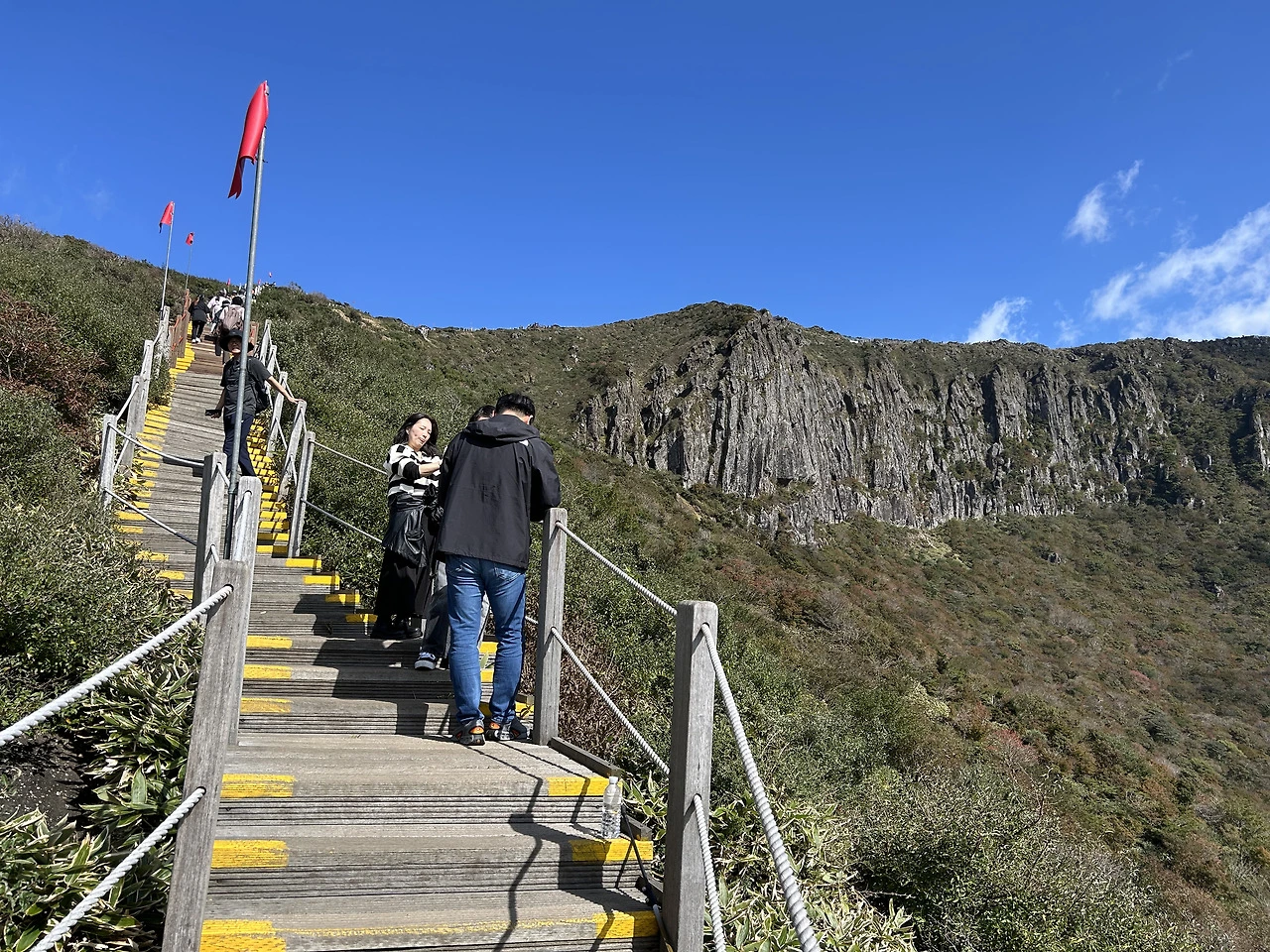 오르막은 계단이 뒤덮고 있어 건강한 젊은이는 슬리퍼나 하이힐을 신고 걸어도 될 만큼 편리할지 모르나 무릎이 좋지 못한 노인들이 작은 보폭으로 느리지만 편안한 속도로 가는 것조차 불가능하게 한다. 긴 여행은 외국으로 가고 국내에서는 짧은 여행만 하는 사람들의 여행 방식에서 이익을 취하려면 최대한 짧은 시간 동안 많은 걸 볼 수 있게 해야 관광객이 올 거라는 마음들이 이리 과도한 개발들을 하게 했나 이해하려 애써 본다. 이곳에서 사진 찍고 저곳에서 사진 찍는 방식의 여행들 때문에 곳곳에 사진 찍을 거리들을 만드느라 여러 명산 입구에 터무니없는 크기의 캐릭터 조형물들을 세워 놓은 건가 짐작도 해 본다.