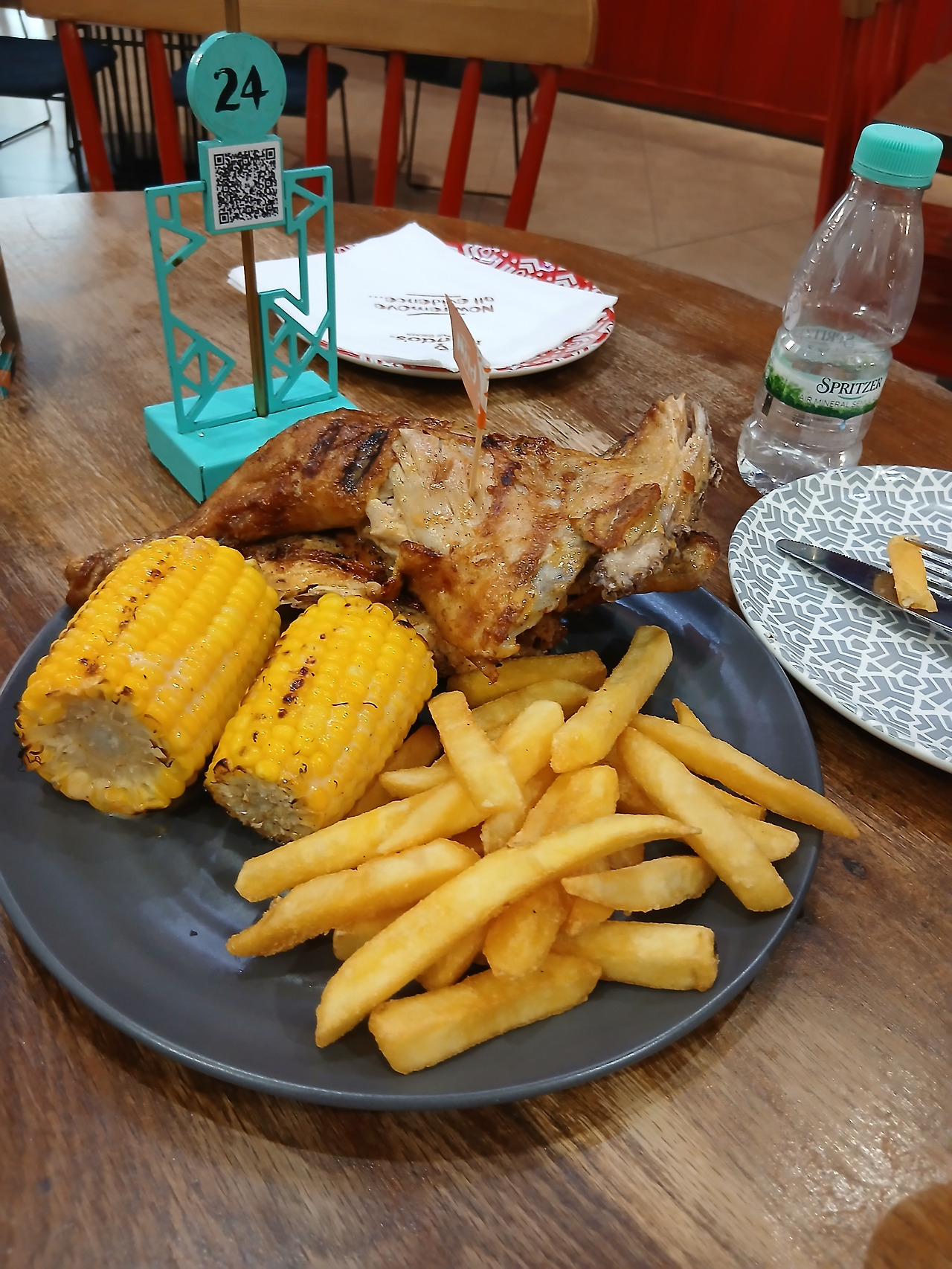 드디어 먹어보네. 난도스도 먹어보고싶었는데 늘 기회가 없었다. 사진에 보면 뭔가 남미의 찐한 컬러의 어떤 바이브가 느껴졌는데 막상 나왔는데...일단 너무 심심한 비쥬얼이었다. 그리고 옥수수 뜨거워서 어떻게 먹지 걱정하면서 한입먹었는데...차가웠다. 저 그을린 그릴자국은 왜있는거니. 실망. 닭이야 아는 맛이고. 감자튀김은 맛있었다. 한국에 안들어온 이유를 알겠다. 한국에서는 흔하게 먹을수 있는거 아닐까 싶다.