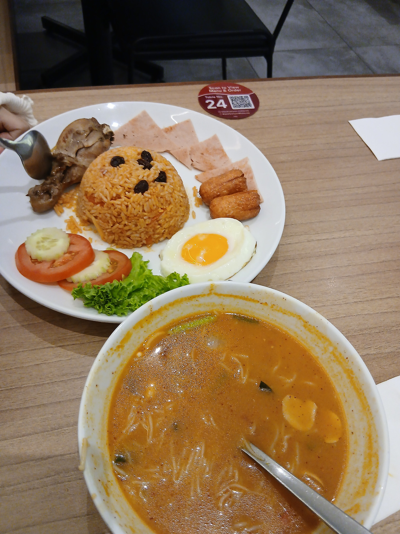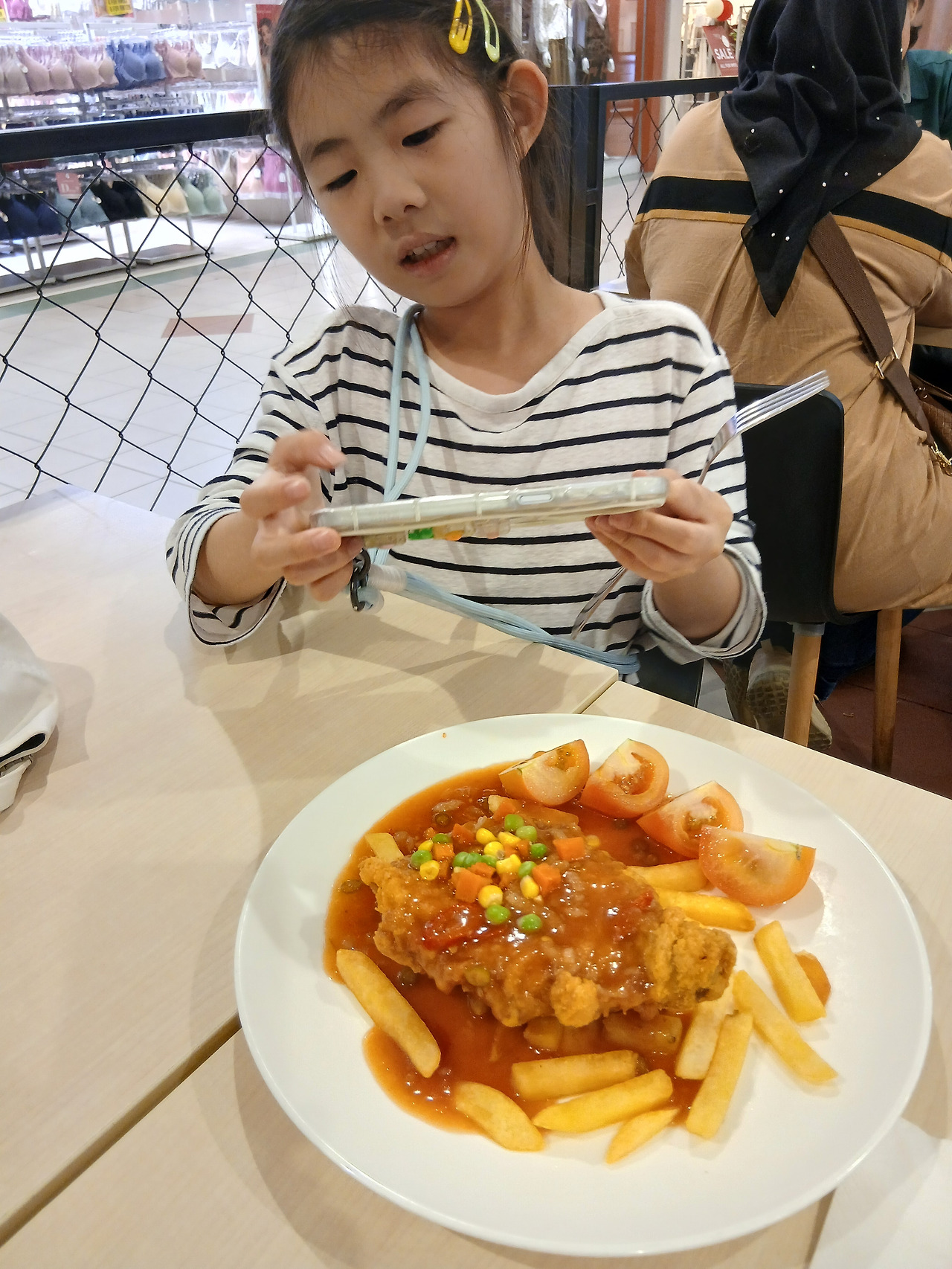 딱 비주얼은 초등학생이 꾸민 느낌이다. 나도 어떻게 업그레이드 해야할지 모르겠다. 여기는 대부분 저런 느낌이다. 재료때문인건가? 그릇때문인건가? 뭔가 더 근사하게 꾸미면 더 맛있어 보일텐데...아쉽다. 고든렘지나 제이미 올리버라면 같은 재료로 어떻게 꾸밀지 궁금하네. 나라면 어떻게 플레이팅 할까? 맨날 고민하는데 모르겠다. 지금 보니 우리나라 고속도로 휴게소 돈까스 플레이팅이랑 비슷한 느낌인데 우리나라는 뭔가 그래도 더 먹음직 스러운데, 뭐가 다른거지? 작은 그릇에 감자튀김 따로 토마토 따로 담아야 할까? 아니면 저 토마토 대신에 방울 토마토로 바꿔야 할까? 그리고 야채좀 깔고? 저 통조림 야채는 치우고? 음...말레이시아 와서 처음 먹은 요리인데 비쥬얼에서 난 맛집이 안닌줄 알았다. 알고보니 프랜차이즈에 장사가 잘되는 집이었다.