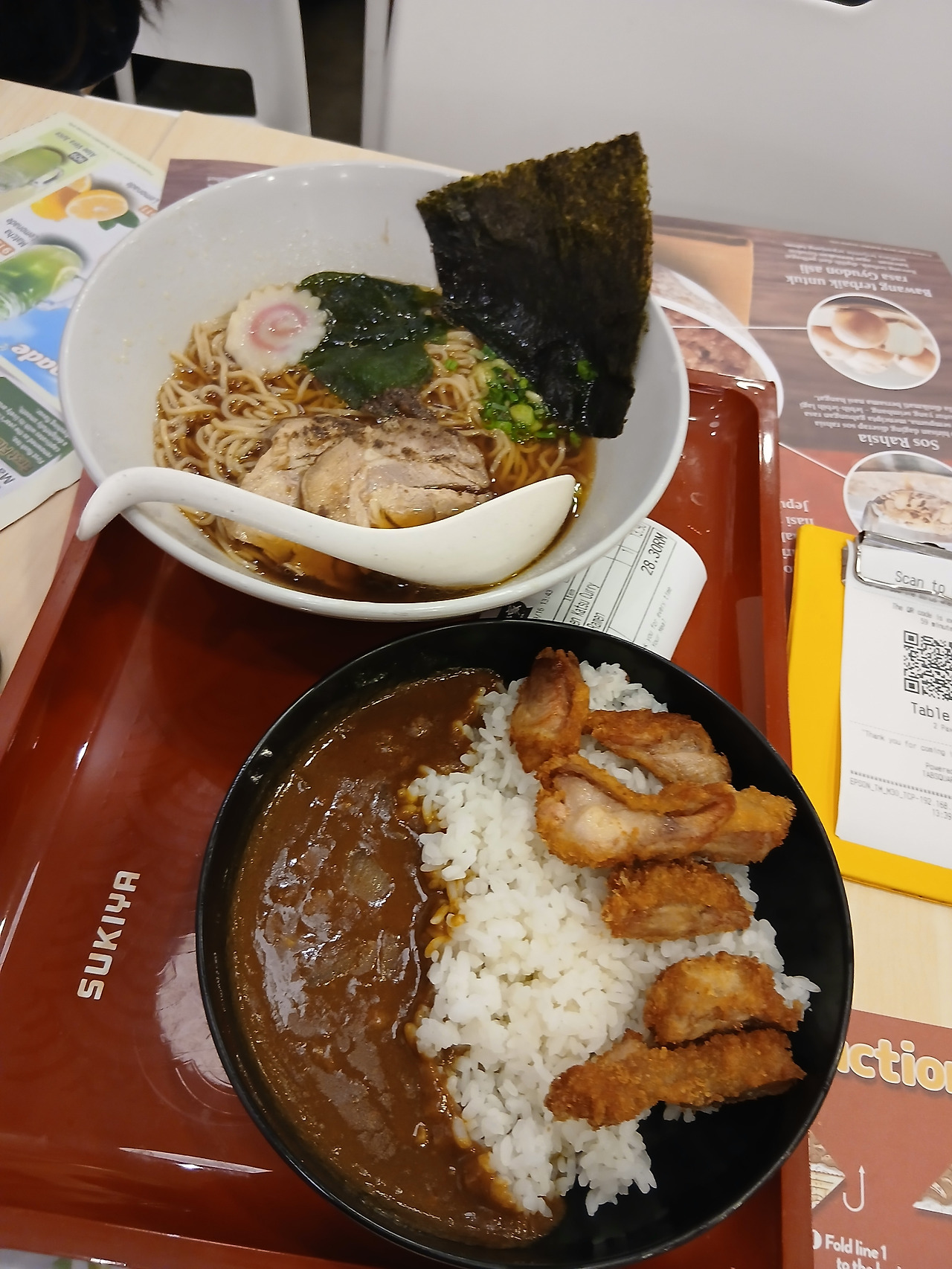 2군데 일본 음식점이 있는데 그 중 하나는 sukiya 다. 많이들 알것 같다. 일본에 워낙 체인이 많아서. 일본 여행 갔다오신 분들은 모를수가 없을듯. 여기서도 가격이 저렴하다. 역시 일본 라면은 짜긴짜다. 그리고 기본적으로 치킨 베이스다. 치킨 국물 라면은 상상이 안가지만 돼지고기랑 맛 차이도 없고, 저 고기도 치킨의 어떤 부위를 자른건지 모르겠지만 말 안하면 돼지고기처럼 보인다.
