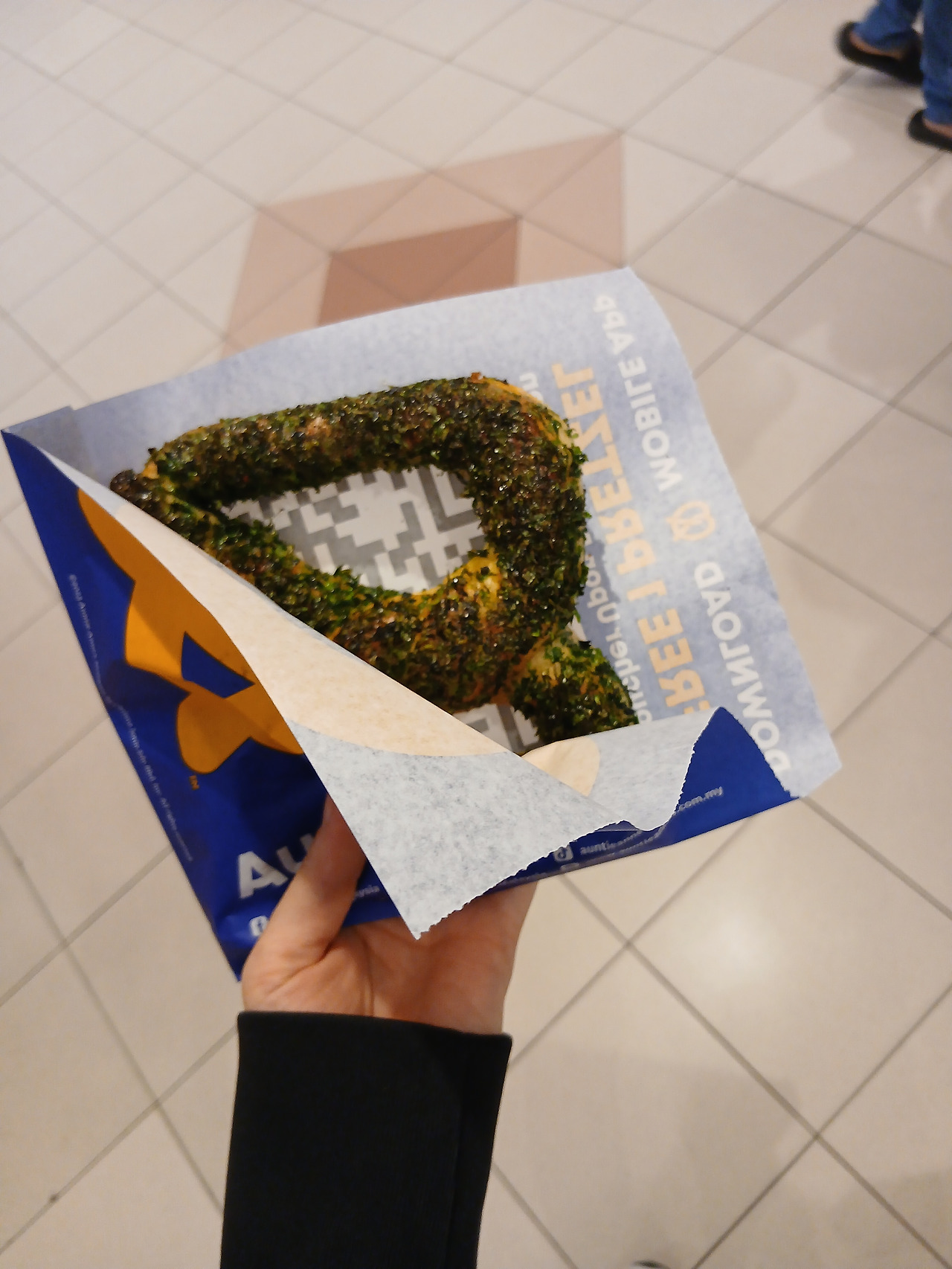 여긴 다 아는 안티앤즈 프레즐이다. 여긴 직접 매장에서 만든다. 그래서 한번 사 먹게 되었다. 그냥 다 아는 맛이라 새로운 맛을 시도해 봤다. 녹차가루도 선택할 수 있었는데 뭔가 더 특이한 거 시켜보고 싶어 Seaweed라서 이상하지만 도전해 봤다.