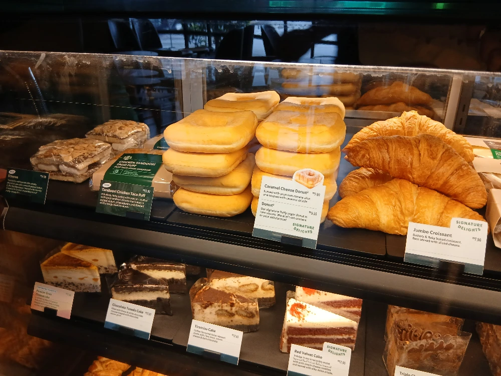 예전 인도 스타벅스는 빵 사이에 풀들이 그렇게 많은 샌드위치가 즐비했는데 여긴 그 정도는 아니다. 가끔 여기도 음식에 초록색 동그라미가 있는 게 있다. 그건 베지테리안 음식이라는 표신데 인도는 초록색, 빨간색 표시가 법적으로 표시해서 팔아야 하는 걸로 알고 있다. 그런데 여긴 그렇진 않다.