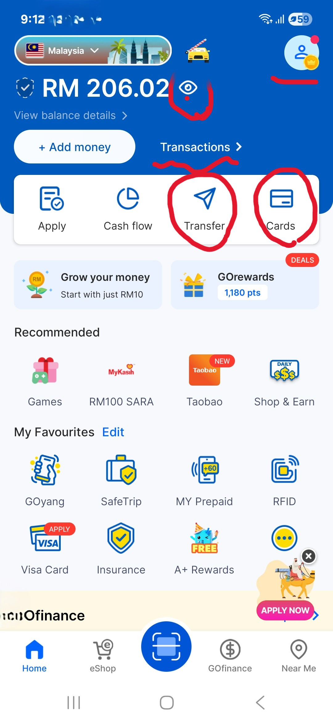 5. 사람모양: 내 정보가 있다. 여기서 터치앤고가 만들어준 내 계좌번호 확인가능하다. (Duitnow)
