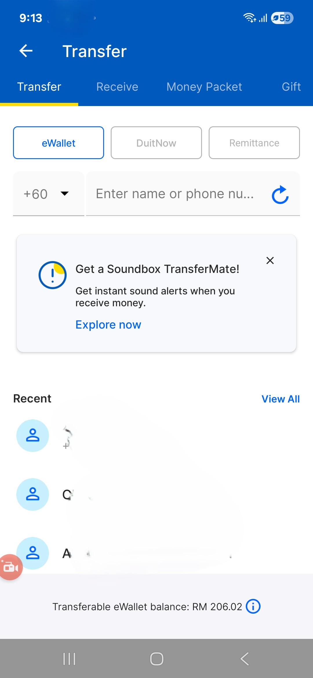 (밑에 바코드 인식하는 파란색 버튼이 보이죠? 식당에서 결제할때는 저걸로 식당 바코드 인식해서 결제한다. 그러면 206.02 링깃 돈에서 빠져나가는거다. 내가 산 2개의 터치앤고카드에서 돈이 나가는것이 아니다.)