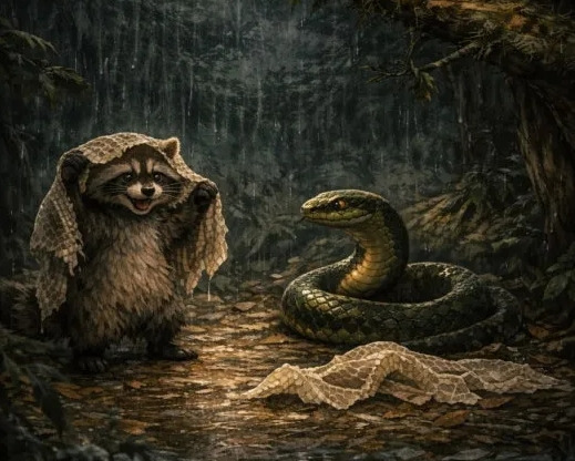 너구리는 허물 끝을 살짝 들어 흔들어 보였다.