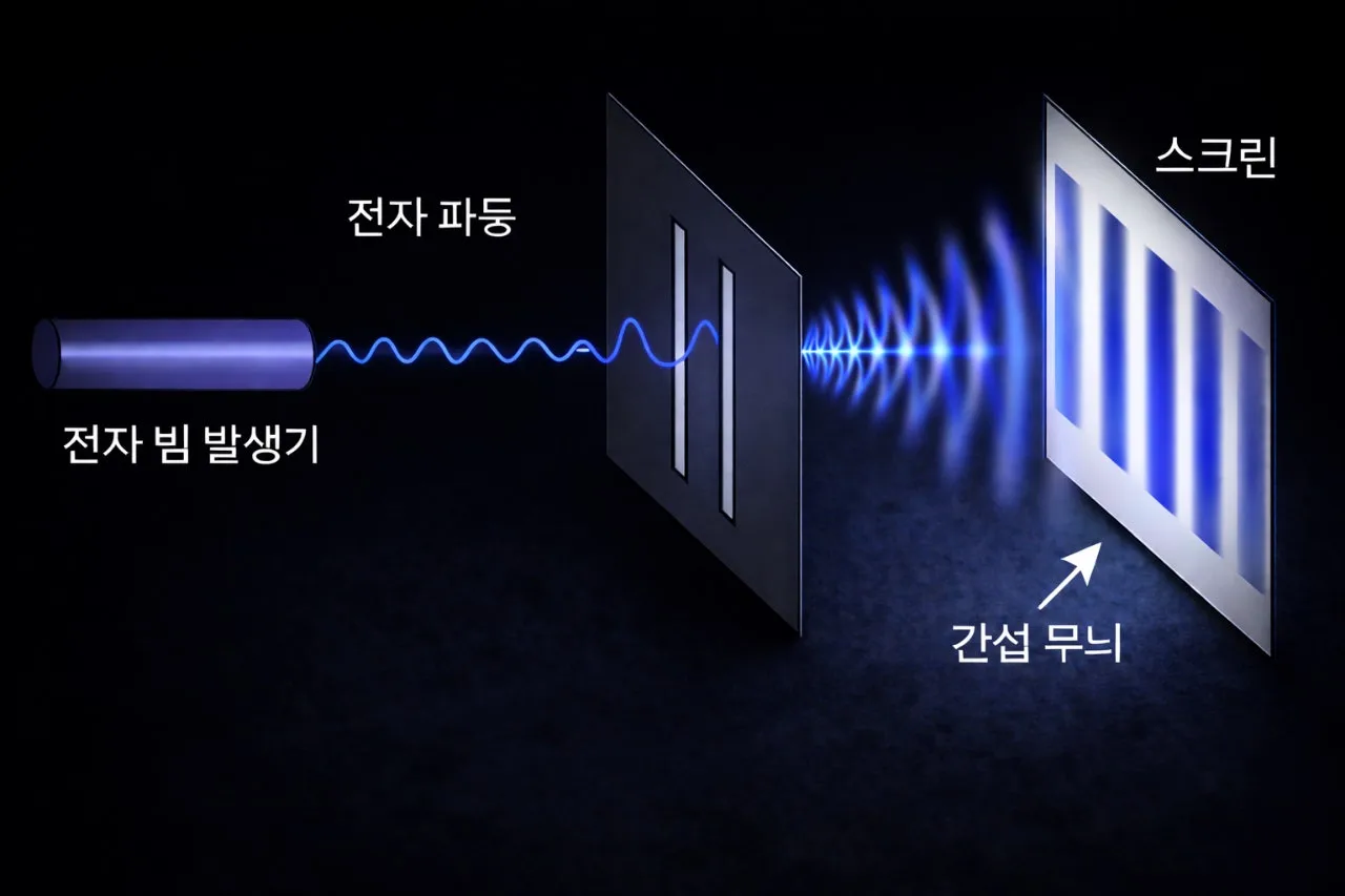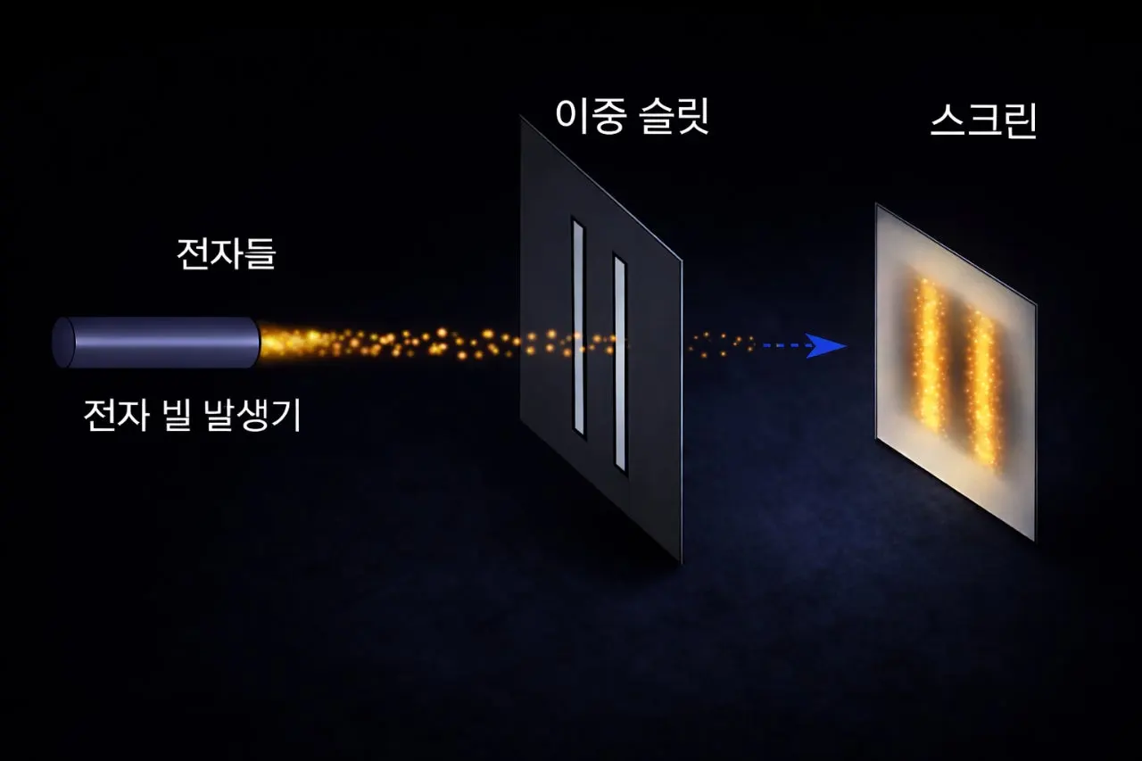 전자는 이중 슬릿을 통과한 뒤, 관측이 없는 조건에서 전자는 파동처럼 퍼지며, 그 중첩이 스크린에 간섭무늬로 기록된다.