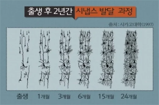 그 답은 뇌 발달과 발달심리에 있다. 인간의 뇌는 성장 과정에서 경험한 환경에 맞춰 신경망을 구성하며, 8개월 아기의 시냅스 형성률이 성인의 10~20배, 3세는 약 2배, 10세 전후에 성인과 유사한 수준으로 떨어진다. 6세 전후부터 시냅스 가지치기(pruning)가 본격화되며, 자주 사용하는 회로만 생존한다. 이는 “사람이 자주 다니면 길이 난다”는 말과 정확히 일치한다.