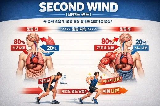 세컨드 윈드는 흔히 ‘두 번째 호흡’이라 번역된다. 운동 초기에는 혈액의 상당 부분이 두뇌와 내장기관에 머물러 있다. 하지만 운동을 지속하면 혈액이 점차 활동 근육과 심폐기관으로 재분배되면서 신체는 본격적인 운동 활성 상태에 들어간다.
