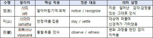 사띠는 소진된 주의를 되찾고, 사마따는 몸과 신경계 안정시키며, 위빠사나는 삶의 태도와 인식의 방향을 전환한다.