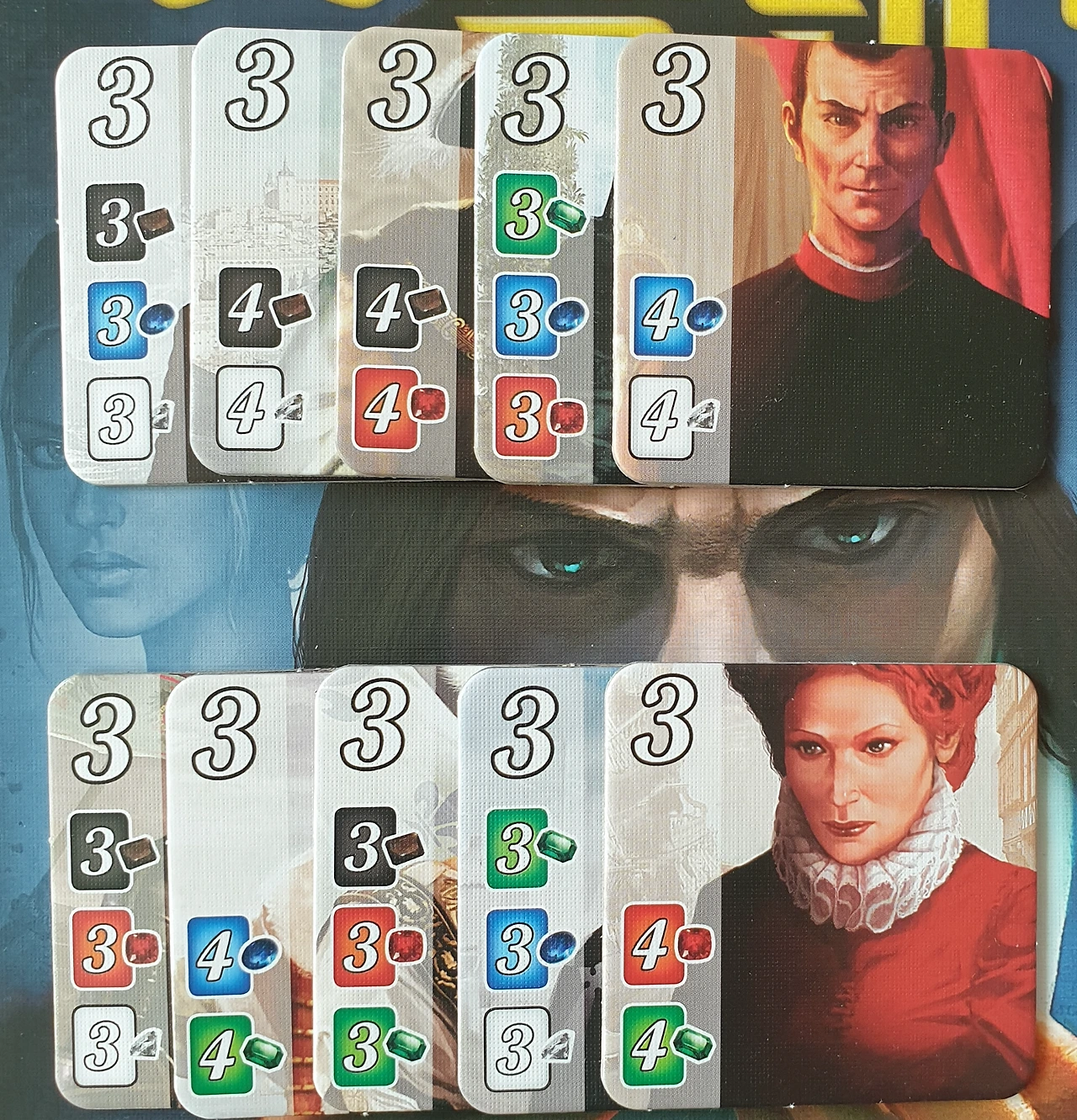 6. 맨 위쪽에 있는 귀족 타일 카드는 총 열개 중에 무작위로 다섯 개를 늘어놓는다. 이 귀족 타일을 구매하는 방법은, 타일 왼쪽 아래에 있는 네모 모양의 숫자와 색깔만큼 카드를 모으면 가져갈 수 있다. 그러니까 각 카드의 왼쪽 아래에 동그라미 모양이 있으면 토큰이나 카드로 사는 것이고, 네모 모양이 있으면 카드만으로 살 수 있다.