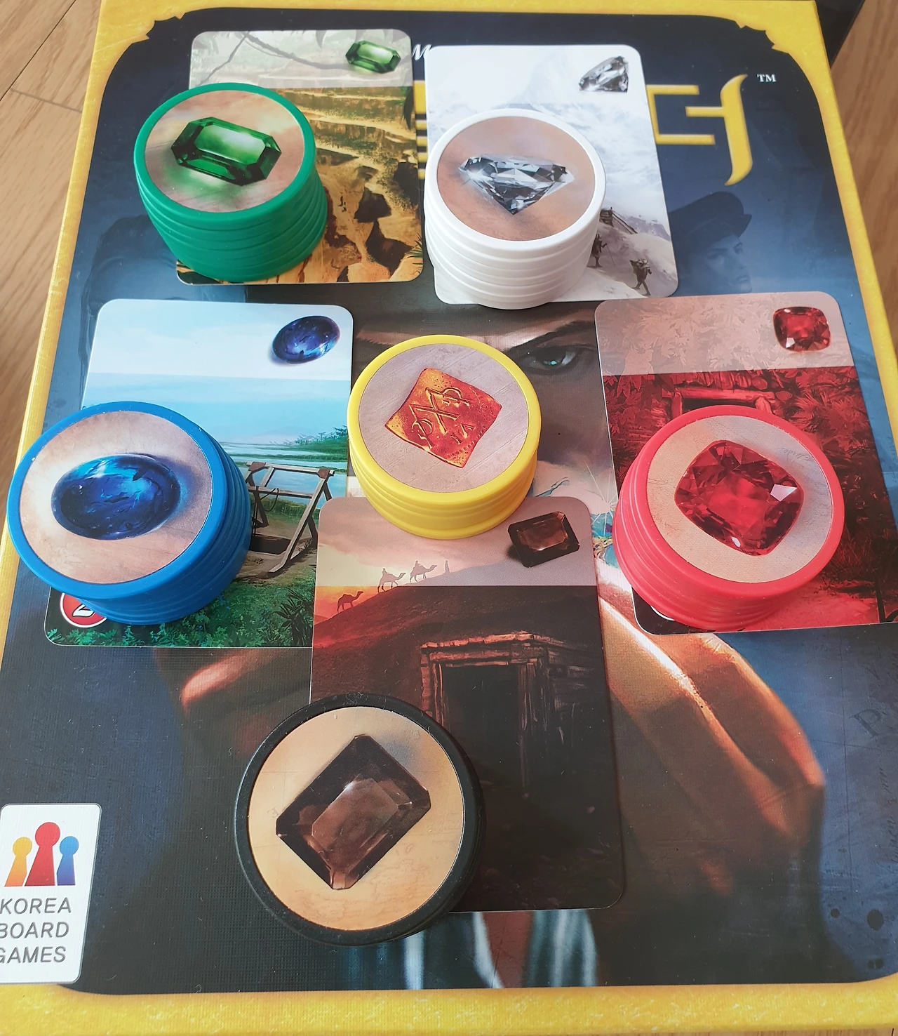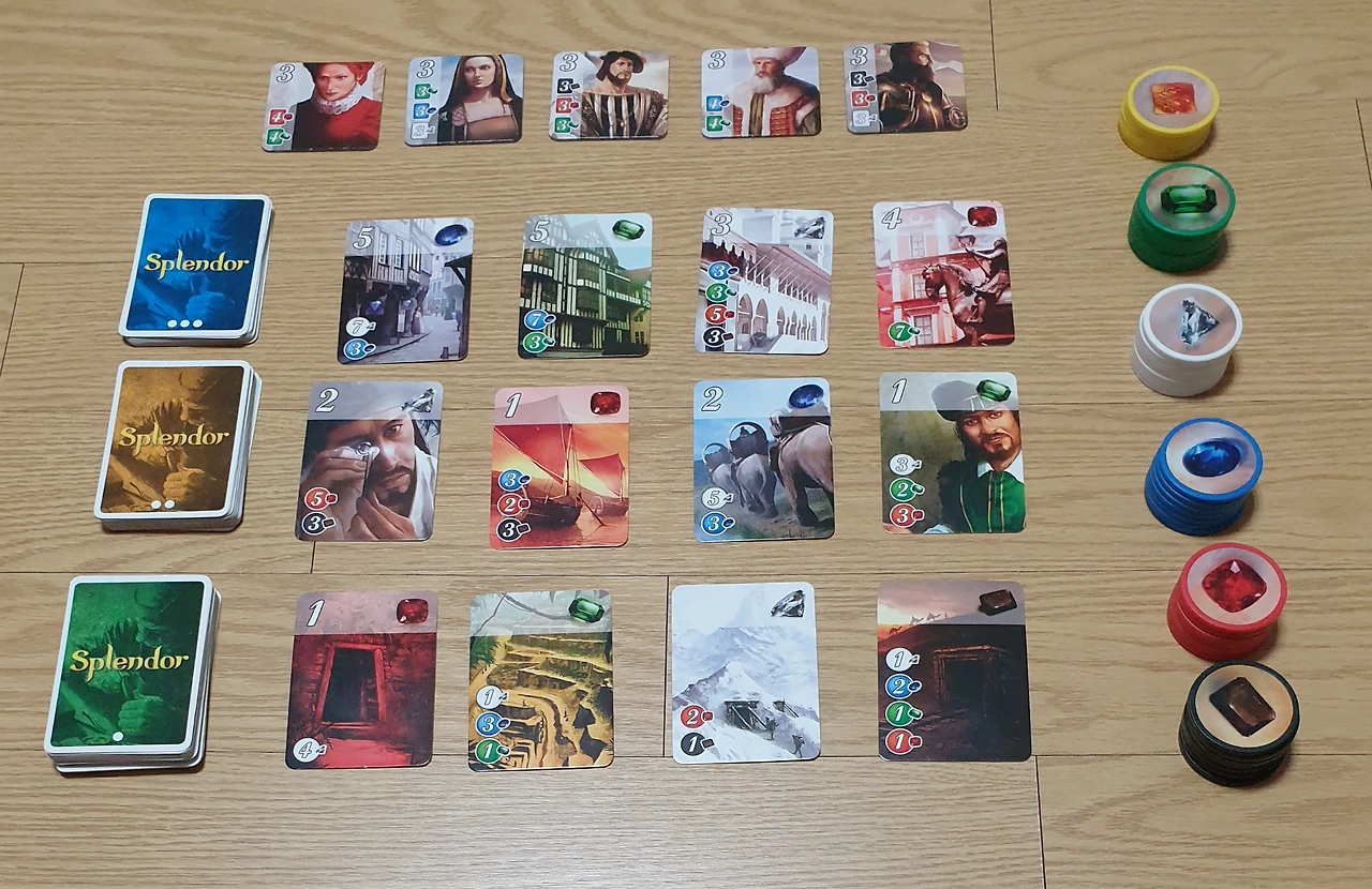 총 40개의 토큰과 90장의 카드, 10개의 귀족 타일이 한 세트다. 보드판은 따로 없다.