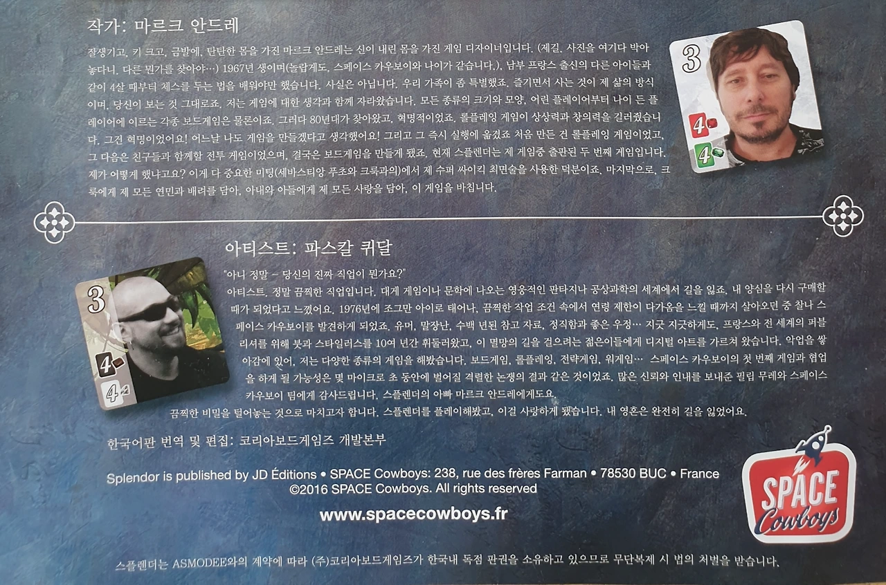 <스플랜더> 보드게임을 고안한 작가와 그림을 그린 아티스트, 출처: 게임 규칙서