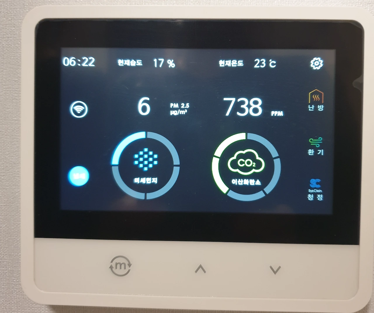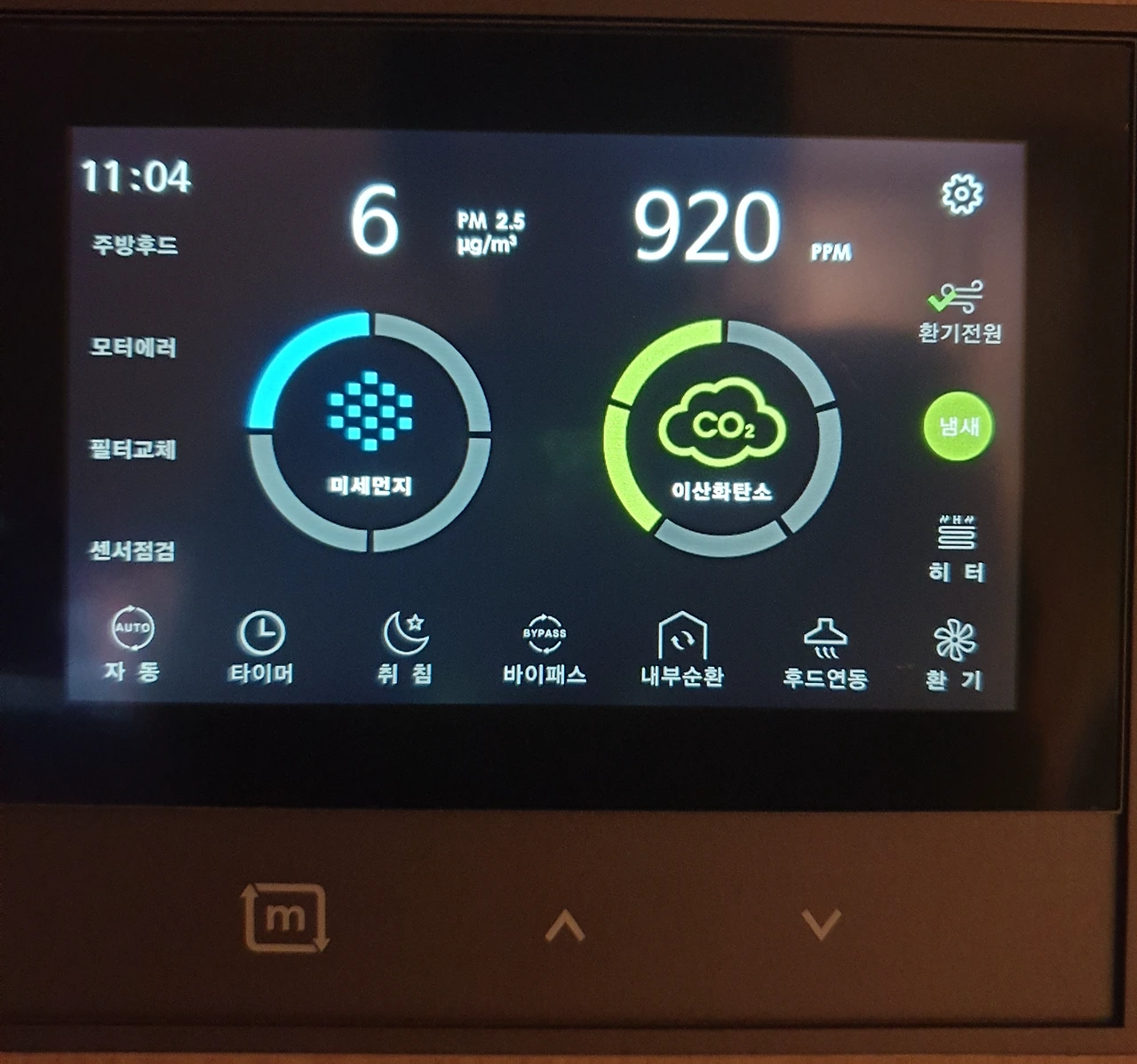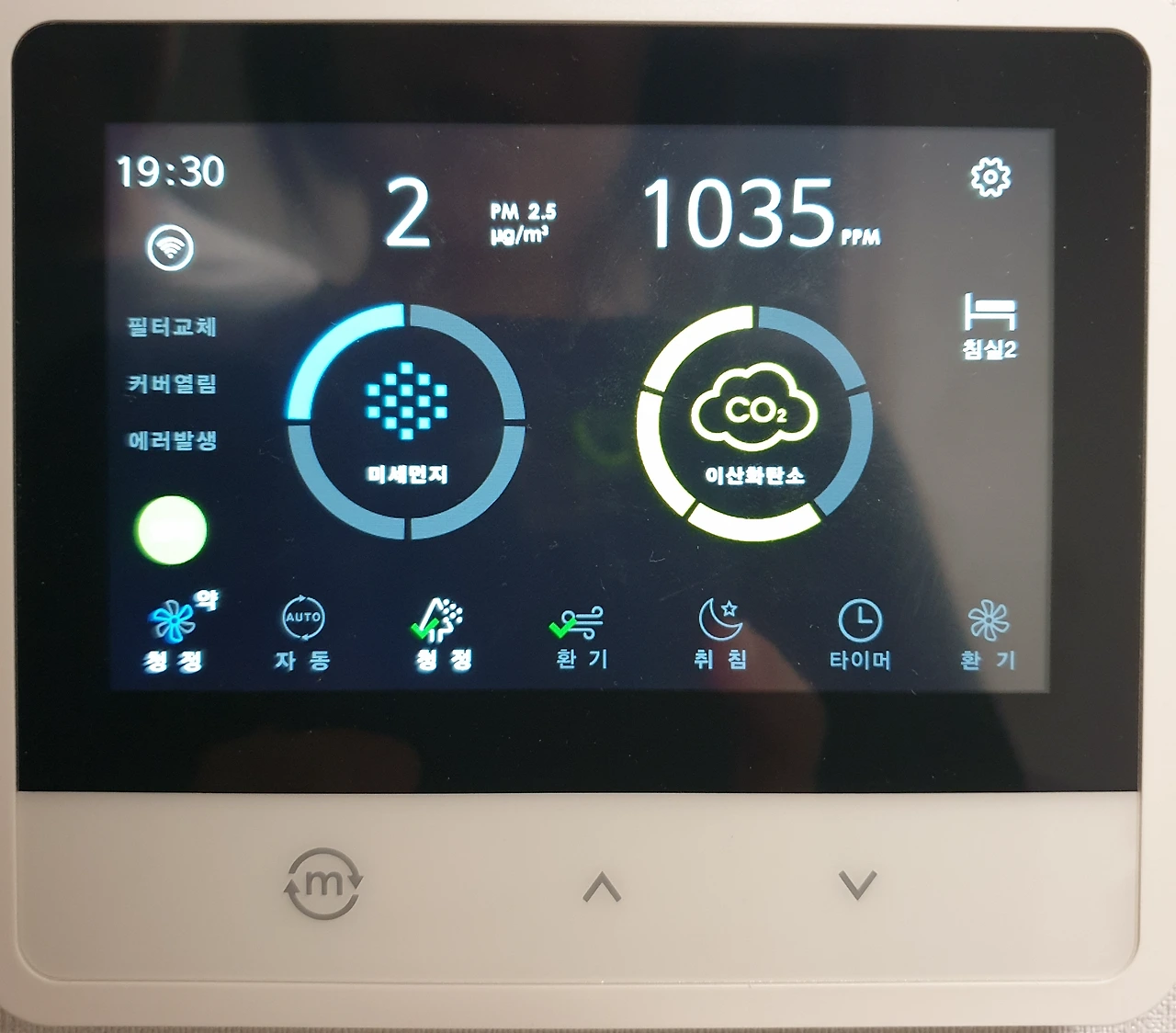 둘째는 공기청정기가 이산화탄소 농도까지 낮춰주지는 않는다는 것이다. 환기시스템을 따로 돌려야 했다. 가장 손쉬운 환기는 창문을 열어서 외부 공기를 들여와 실내 공기를 순환시키는 것이다. 그런데 먼지 때문에 문을 열 수가 없으니 곤란했는데, 마침 환기 시스템이 있기에 가동해 보았다. 필터로 거른 외부공기를 주입시키는 것 같았다. 환기시스템을 가동한다고 해서 미세먼지 농도가 올라가지는 않았다.