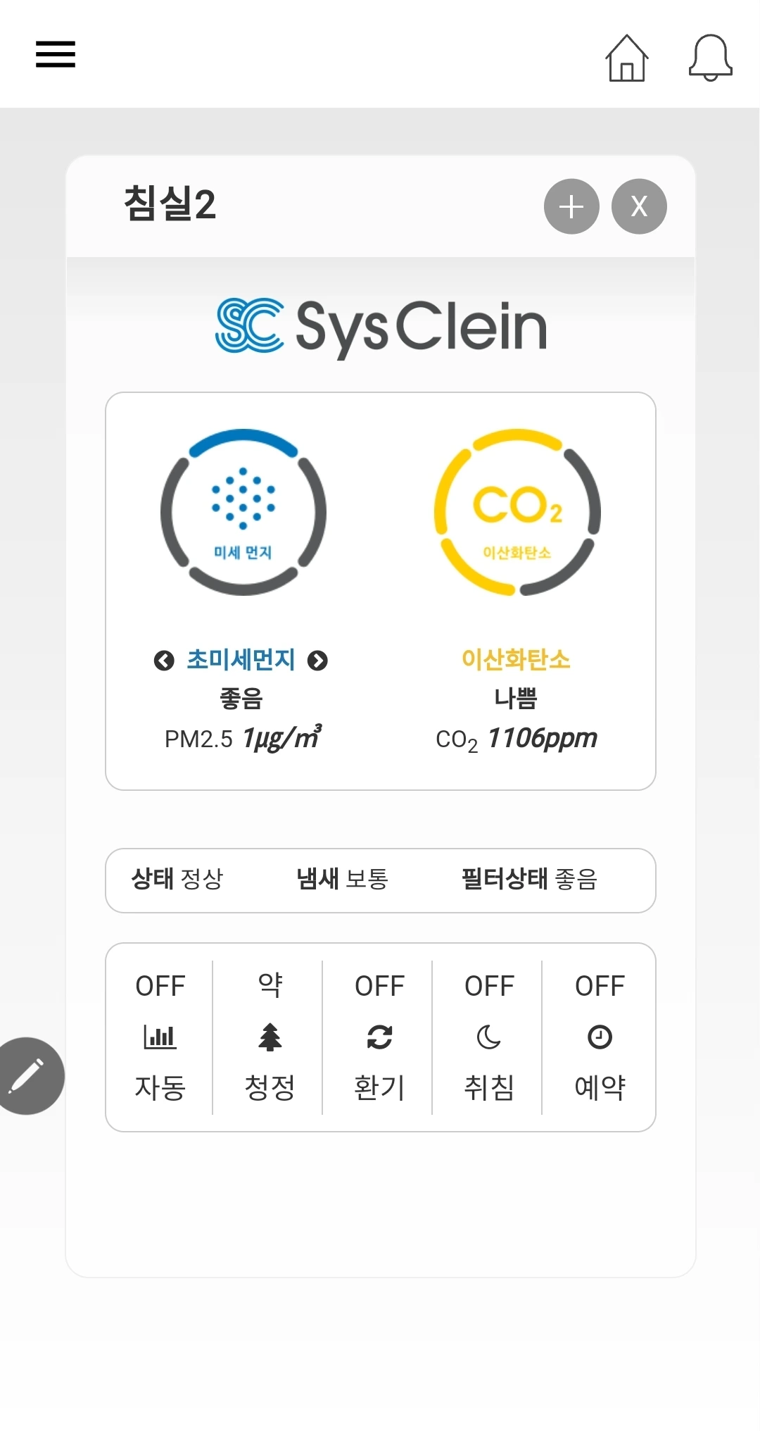 공기청정기 가동은 각 방 벽에 부착되어 있는 패드를 이용하거나, 자이 스페이스 앱에서 할 수 있다.