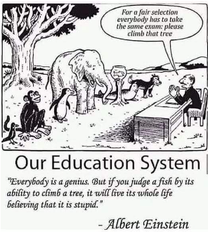 (그림 아래) 아인쉬타인의 말: 우리의 교육체계 "모두가 천재이다. 하지만 당신이 물고기를 나무를 오르는 능력으로 판단한다면, 물고기는 평생에 걸쳐 자신을 바보라고 여기면 살아갈 것이다. "