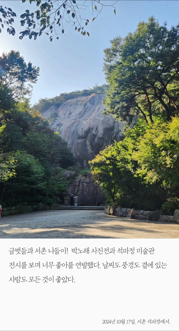 4월부터 가고 싶었던 석파정 미술관이 드디어 공사를 끝냈다는 소식에 글벗들과 함께 한달음에 달려갔다. 박노해시인 사진전의 시를 품은 사진과 석파정 미술관의 그림, 그리고 미술관 옥상의 석파정은 서울은 정말 낭만적인 곳이라고 말해주고 있었다. 복잡함만 있는 게 아니라 이렇게 여유로운 곳도 있다며 서촌의 이방인인 나에게 친절하게 알려주었다.