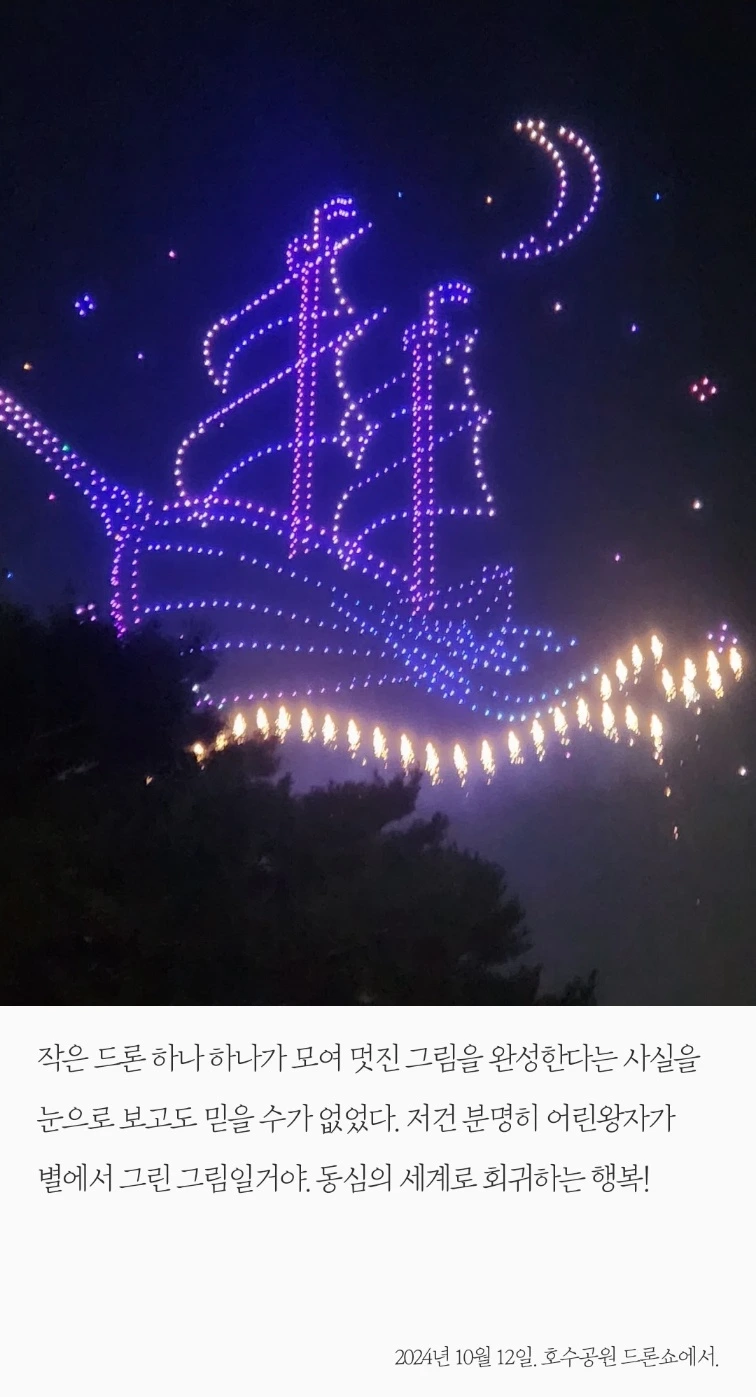 10월에는 호수공원에서 호수예술축제를 한다. 몇 년 동안 바쁘고 귀찮다는 이유로 호수예술축제에 관심을 두지 않았는데 올해는 남은 가을을 제대로 느껴 보겠다는 마음으로 축제 속으로 들어갔다. 불꽃놀이와 불꽃드론쇼가 있는 밤, 그 많은 인파 속에 친구와 엉덩이를 붙일 조그만 자리를 잡고 돗자리를 깔고 앉아 입을 다물지 못하고 하늘을 바라봤다. 드론이 수놓은 밤하늘 속 이야기는 피터팬을 만나 하늘을 나는 것처럼 놀랍고 신비로웠다.