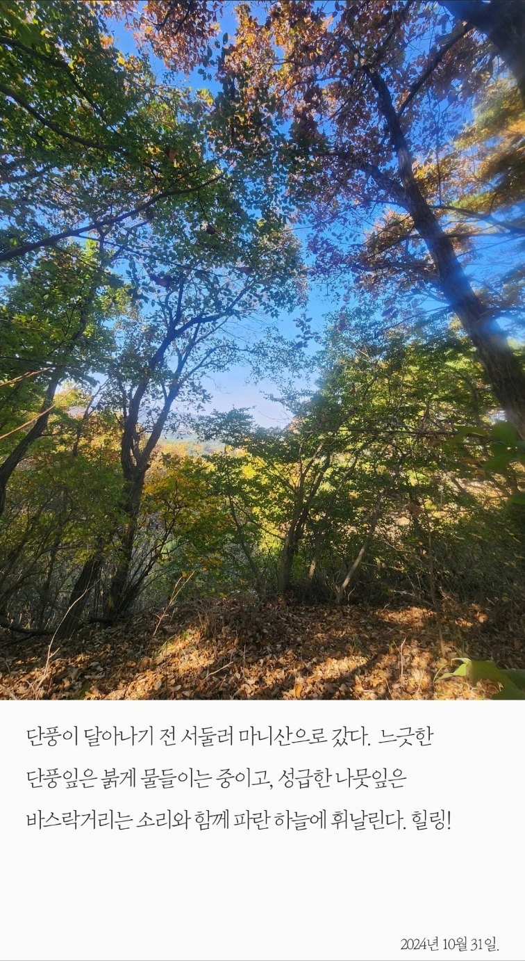 단풍이 겨울로 숨어버리기 전에 나 홀로 마니산을 가기로 결심했다. 강화도까지 1시간을 넘게 운전한 후, 혼자서 마니산을 오르는 건 생각보다 쉽지 않았다. 나는 높이 올라가기보다 내가 발을 딛고 서 있는 곳에서 아름다움을 찾기로 했다. 몇 걸음 걸어가다 나뭇잎 떨어지는 모습이 예쁘면 그곳에 앉아 바스락 거리는 소리를 눈으로 보고 귀로 들었다.
