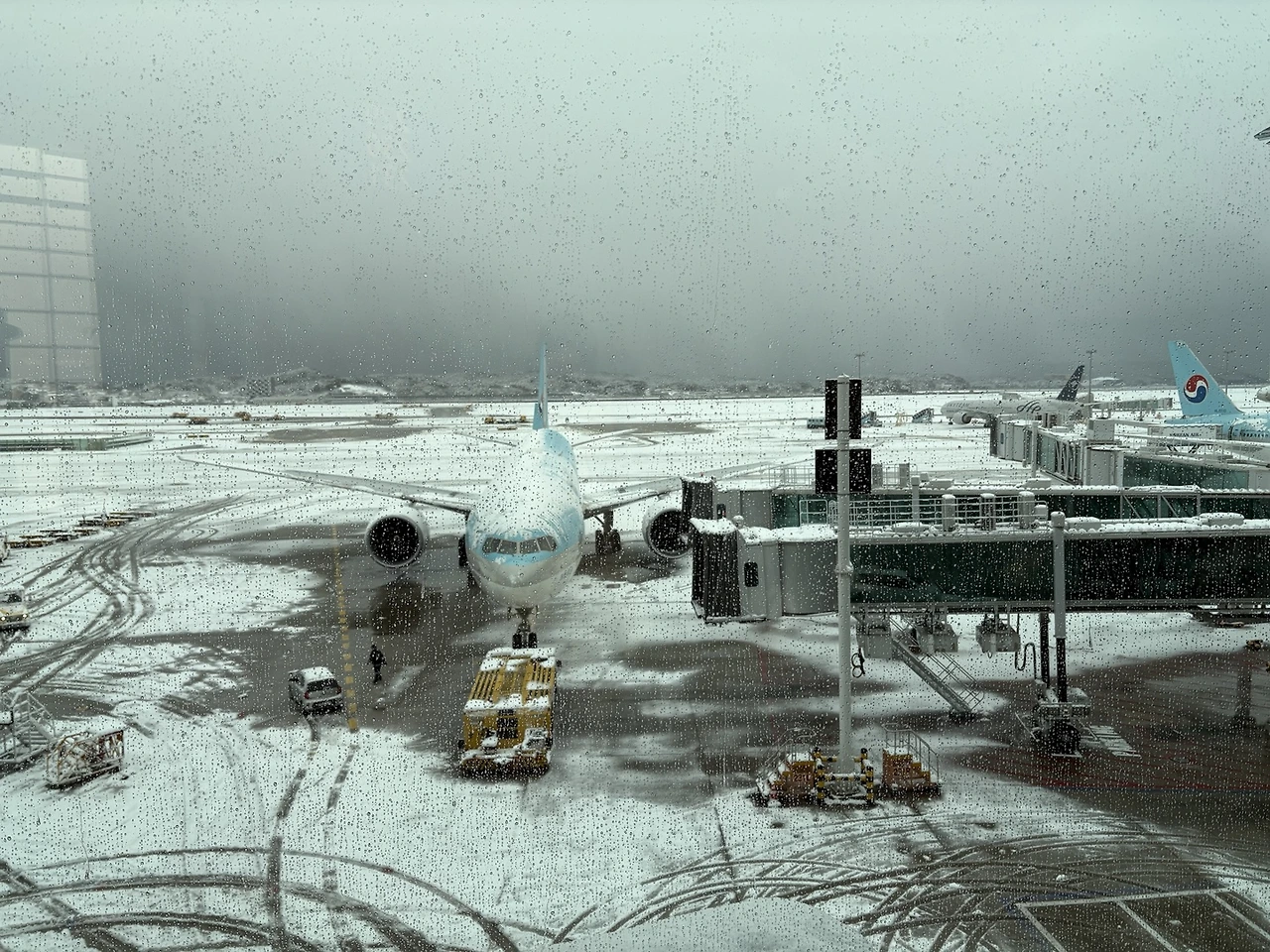 출국 전 통과의식인 컵라면 한 사발까지야무지게 해치웠을때 한국을 떠날 만반의 준비를 끝냈다고 생각했다. 당당한 걸음으로 탑승구에 도착하니 폭설로 인해 비행기는 기약 없이 지연되고 있었다. 눈발은 더 굵어져 농밀한 밀도로 허공을 가득 채우며 흩날리고있었다. 창 밖에 서 있는 비행기 몸체에는 화이트 아이싱을 뿌린 것처럼 하얀 눈이 쌓여 있었다.폭설이 내린 어느 날, 빗자루를 가져와 자동차의 눈을 쓸어 냈던 것처럼 비행기에 쌓인 눈을 쓱쓱 털어내면 좋으련만 실상은 트럭이 와서 디아이싱용액을 뿌려서 녹여야 했다.