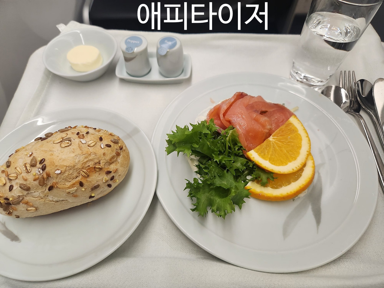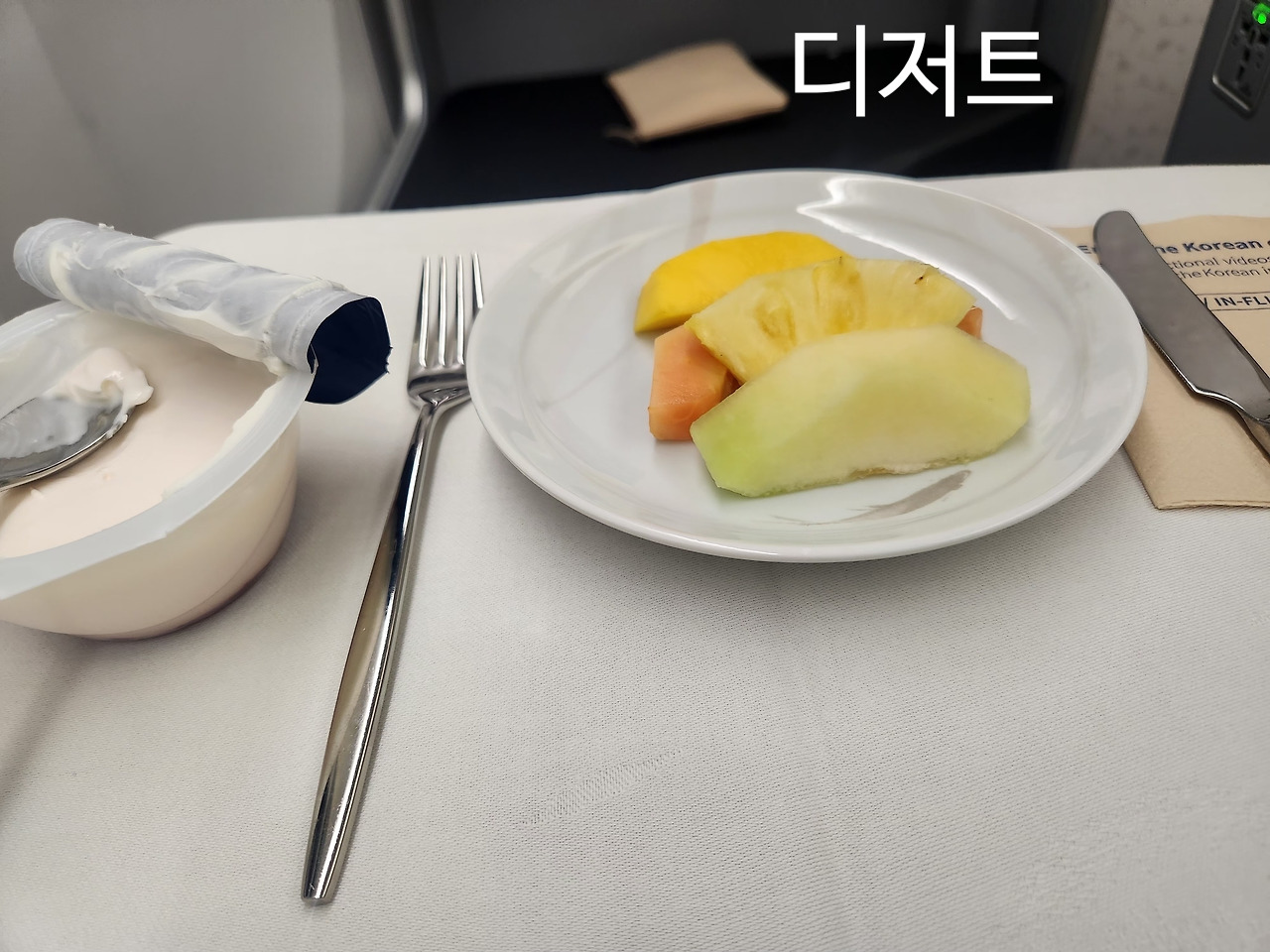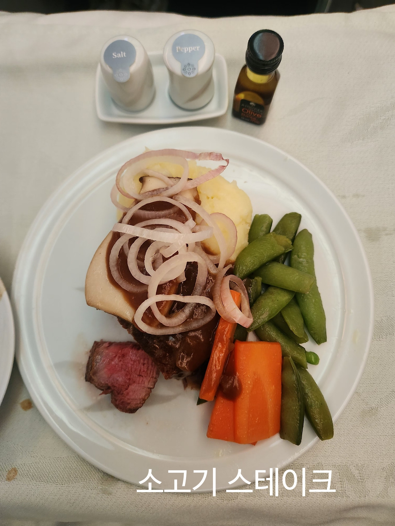 첫 번째 기내식은 애피타이저 두 번 메인 요리 한 번 디저트 두 번으로 메인 요리는 미리 주문을 받았다. 첫 번째 기내식으로 소고기 스테이크를, 두 번째로는 대구구이를 골랐다.