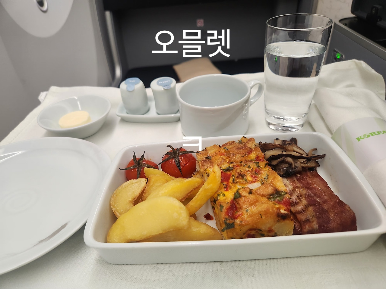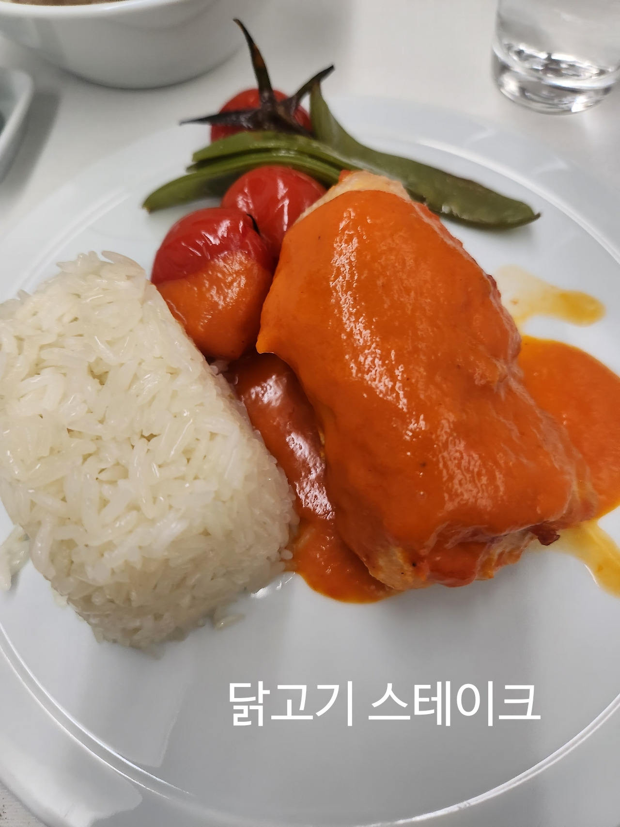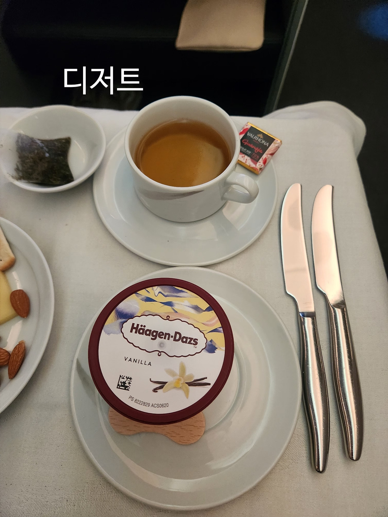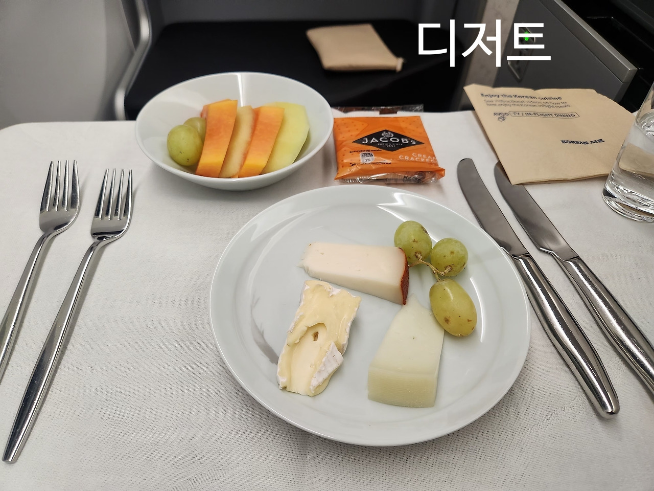 첫 번째 기내식은 애피타이저 두 번 메인 요리 한 번 디저트 두 번으로 메인 요리는 미리 주문을 받았다. 첫 번째 기내식으로 소고기 스테이크를, 두 번째로는 대구구이를 골랐다.