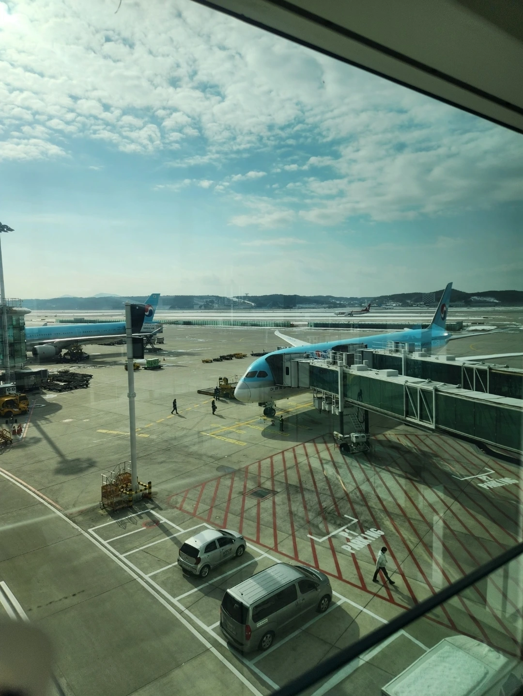 파란 하늘 아래 눈이 쌓이지 않은 말끔한 비행기가 서있는 걸 보니 목욕을 끝낸 아기의 동글동글한 몸을 보듯 예쁘고 반갑다.