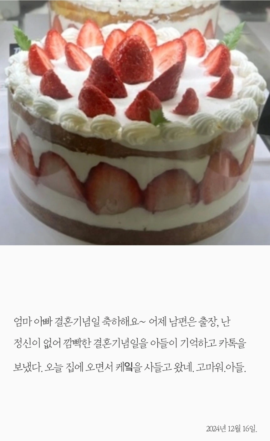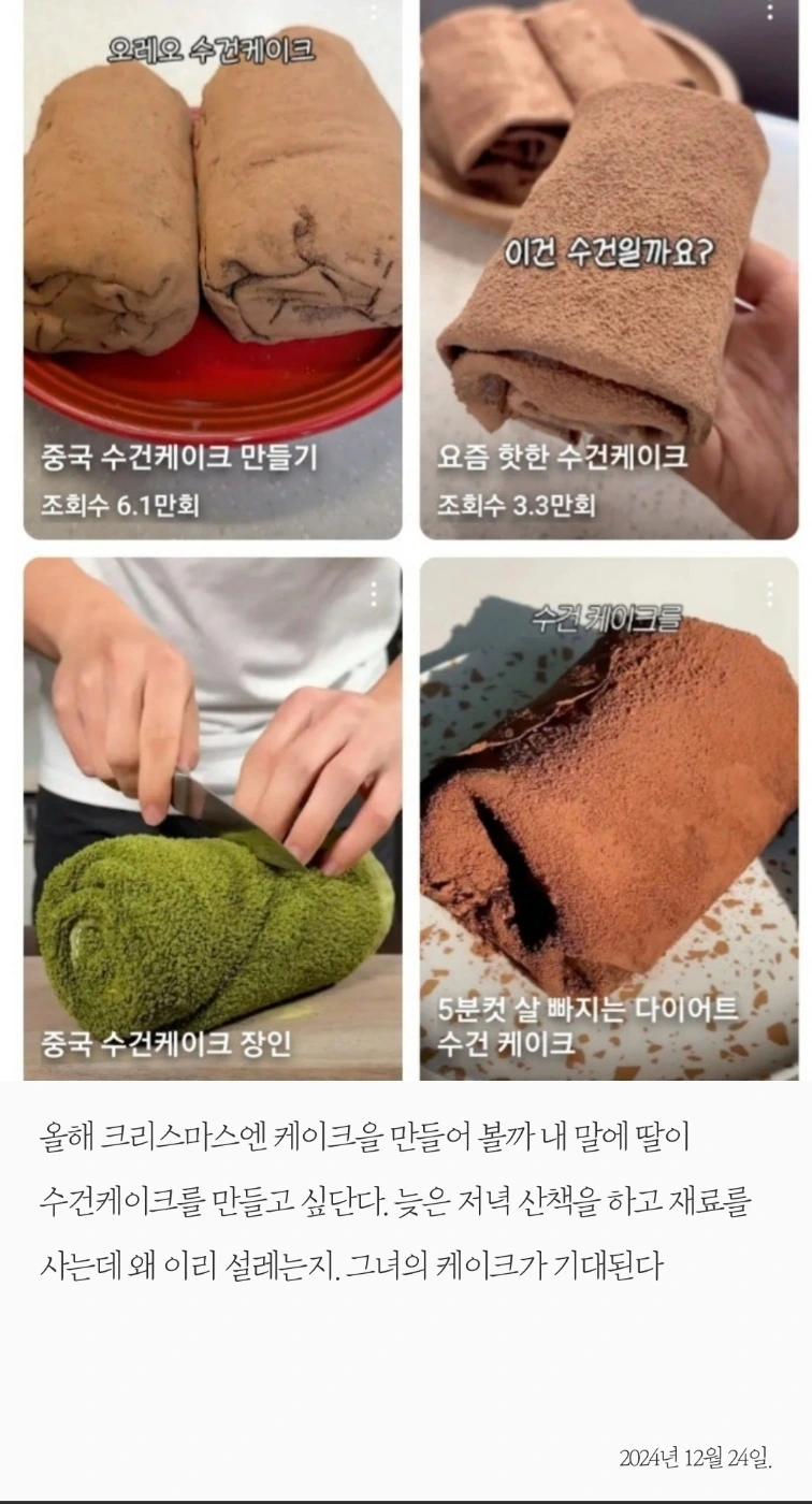 결혼기념일에 아들은 프레지에 케이크를 사 오고 딸은 며칠 뒤 수건 케이크를 만들었다.